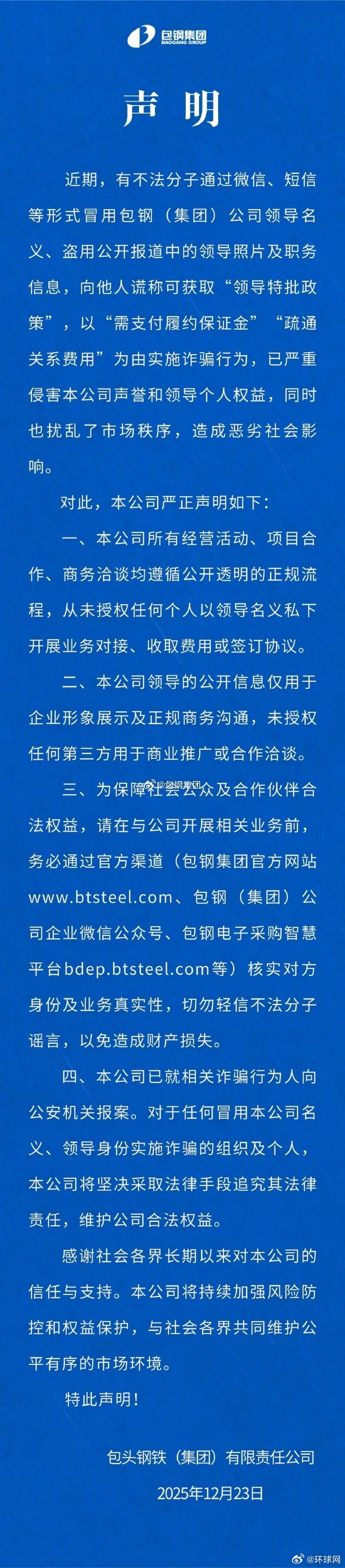 【#包钢集团声明#】包钢集团:公司领导被盗用照片及职务信息用以行骗,已向公安机关报案