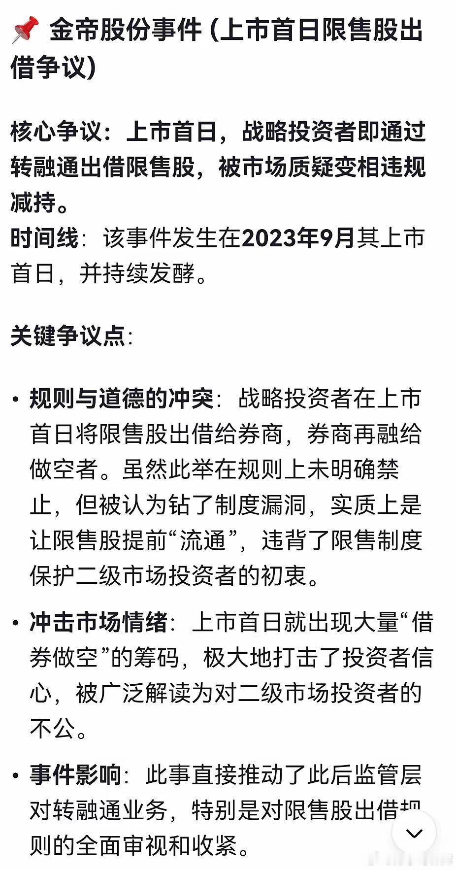 大家还记得2023年大熊市时的“浙江国祥”和“金帝股份”吗,这两个IPO分别暴露了缅A两个极其严重的漏洞!前者是垃圾资产重新包装后二次上市,且保荐机构和上市IPO公司交叉持股,虚高发行利益输送,最终结果是,浙江国祥虽然都拿到了上市代码603361,但在最后几天即将上市时被临时叫停!之后一直到现在也没有再次发行上市!后者是上市当天,大股东将限售股全部借出用于做空,这与限售股三年内不可流通(大股东,实控人)的规定相悖,但在当时的规则下,却又是合规的,因为上面指定的规则允许这种操作!这两个事件,在当时的缅A被吵的沸沸扬扬,最终结果是,前者终止上市,但对于机构是否存在利益输送,没有下文了,后者由于大量网友股友的不满,在2024年彻底禁止了限售股转融通,并且据说提出“限售股转融通”政策的方某人,也被免职,不过其重新任职了另外一个重要岗位。缅A,需要群众的监督,需要拿着鞭子抽打,才可以变得完善和可投资!不过,不管怎样,在当前的重要转折点,缅A必须要肩负起经济发展转型的重任,不行也得行!加油吧明年2026,来个全面的大牛市,让大家都可以有理由有动力有预期,去大力的消费,帮助东大的经济重振雄风!也让金融强国真的可以早一点到来!!!