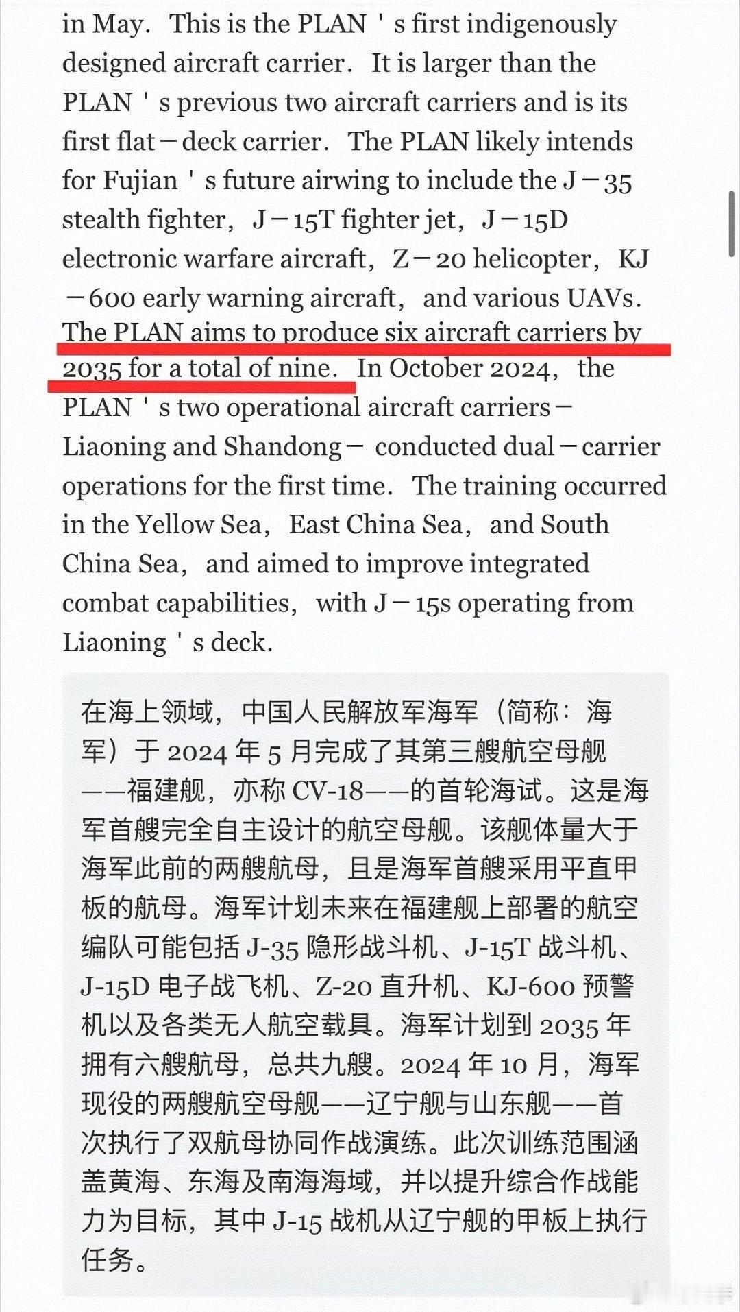 美报告称2035年中国或有9艘航母美国的报告保守了,应该是“至少”而不是“或有”9艘航母。