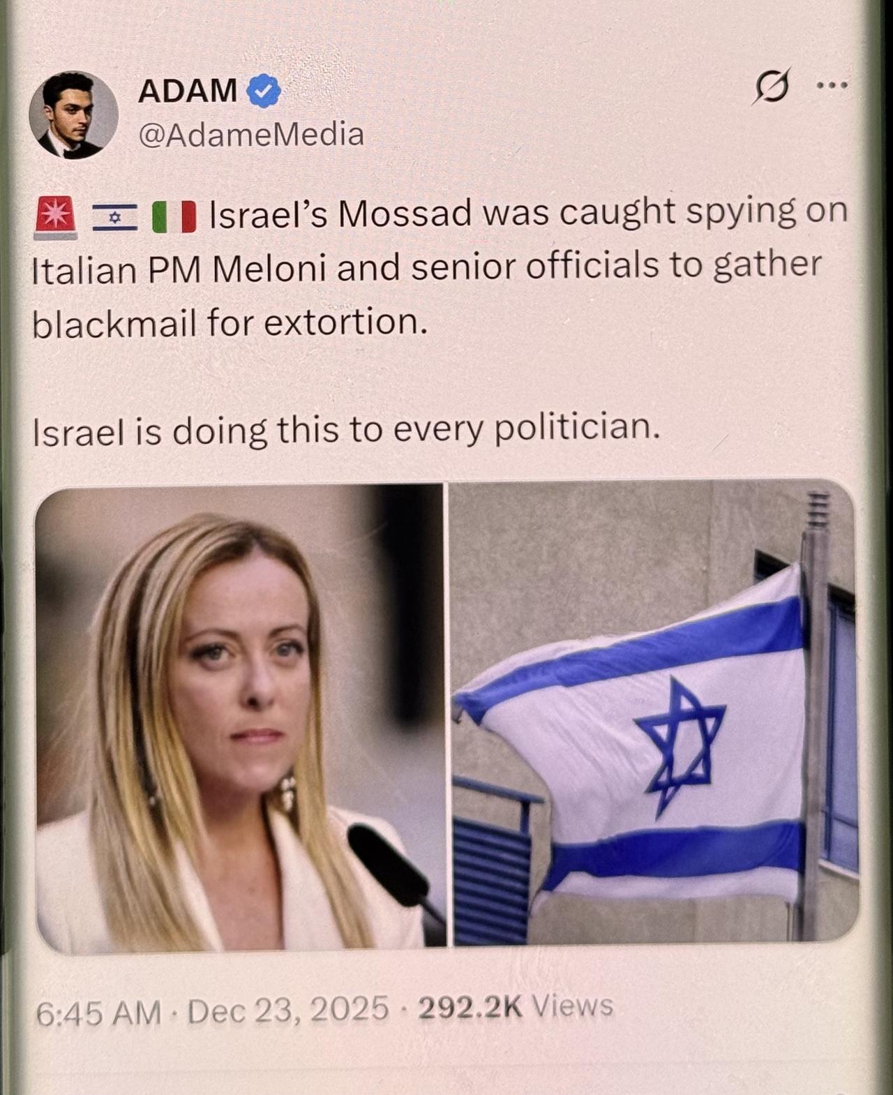 惊天丑闻!以色列摩萨德被抓现行! 监视意大利总理梅洛尼还不够,连高官都没放过! 明晃晃搞窃听、挖黑料,目的就一个——赤裸裸的敲诈勒索! 更可怕的是,这根本不是个案! 以色列对各国政客,全是这套操作! 想想都后背发凉,还有多少国家的政要,正被偷偷盯着? 这事儿一爆出来,可真是捅了马蜂窝。摩萨德,这名号听着就神秘,以前电影里觉得特厉害,干大事的。好家伙,现在一瞅,这干的叫啥事?盯上人家意大利总理,连带着手下高官一个不落,这是把别人家当自家后院了,想听啥就听啥,想看啥就看啥。 敲诈勒索,这词儿用得太准了。为啥要费这么大劲儿搞窃听?不就是为了捏住人家小辫子嘛。政客们谁没点私事、谁没点不想让人知道的谈话?摩萨德这帮人,专门挖这些见不得光的料,攥在手里那就是王牌。关键时刻拿出来,你不听话?不按我的意思来?那对不起了,明天头条见。这比明刀明枪的威胁可毒多了,杀人不见血。 说这不是个案,我信。想想看,意大利能被盯上,别的国家就能幸免?估计名单一长串,只是有的没发现,有的发现了不敢吱声。这次是意大利抓了现行,捂不住了,才闹得天下皆知。那些还没曝光的,暗地里指不定怎么提心吊胆呢。自己办公室里说话都得防着有耳朵,这领导当得也太憋屈了。 为啥这么干?说白了,就是想把别人捏在手心里,给自己谋好处。国际上的事,利益错综复杂。用这种下三滥的手段,逼着别国在政策上倾斜,在投票上站队,在关键问题上闭嘴。这不是堂堂正正的外交,这是间谍行径,是拿不上台面的阴招。 这就让人琢磨了,他们这胆子也太肥了,就不怕激起众怒?可能觉得自家手段高明,不会被抓包。也可能觉得就算被抓了,别人能拿我怎样?这种有恃无恐的劲儿,才最让人害怕。今天能监听意大利,明天指不定就对谁下手。哪个国家的政要还敢放心谈事情?国家之间的信任,被这些暗地里的勾当搅得稀碎。 咱们普通老百姓看着,都觉得脊梁骨冒凉气。高层人物尚且被这么摆弄,国家机密在这些机构眼里还有安全可言吗?今天他们用这招对付别国政要,谁知道明天会不会用在别的什么地方?这种毫无底线、只求目的的操作方式,简直是给国际关系埋雷。 信任建立起来难,毁掉可太容易了。摩萨德这么一搞,以后谁还敢轻易跟他们交底?国家之间打交道,起码的规矩和底线总得有吧。这种把监听、勒索当家常便饭的做法,是在玩火,迟早烧到自己。 各位读者你们怎么看?欢迎在评论区讨论。上联:山重水复疑无路;诚邀下联 以色列出事 以色列出大事情 中东狠人以色列