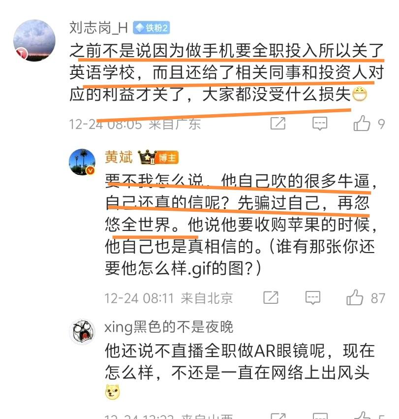 罗永浩前合伙人黄斌,再次爆料当年的老罗英语从没挣到钱!挣了一年钱的说法是老罗对外吹的牛逼! 在评论区,黄斌这样回复网友的疑问:“(老罗英语)有没挣过钱我会不知道?” 针对越来越多攻击,罗永浩终于回应了:等忙完发布会后,再报仇! 哈哈,要大热闹了!