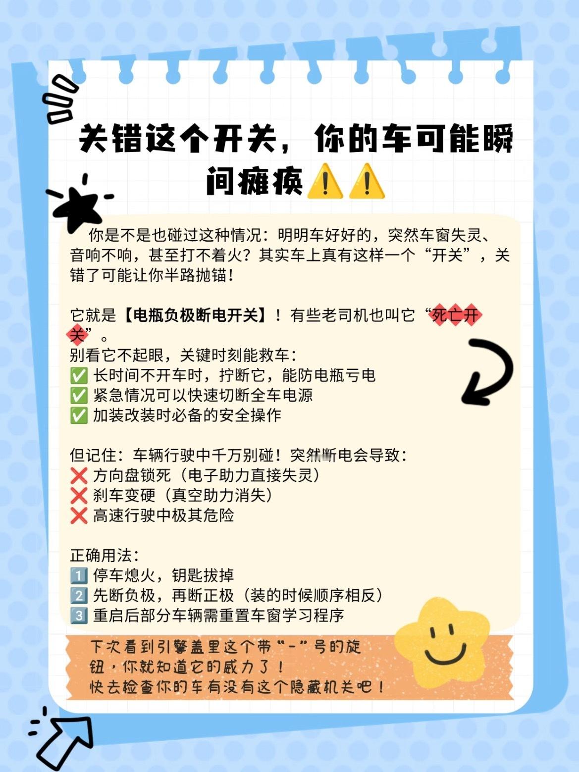 提问:明明车看起来好好的,却突然车窗失灵、音响不响,甚至直接打不着火。这很可能是因为一个不起眼的小开关被误碰了【电瓶负极断电开关】✅ 它什么时候有用?长时间不开车时,拧断它可以防止电瓶亏电紧急情况下能快速切断全车电源加装设备或维修时的安全操作必备⚠️ 但千万记住:行驶中绝对不能碰!一旦在开车时断电,会导致:1️⃣方向盘电子助力失灵,瞬间锁死2️⃣刹车助力消失,踏板变硬踩不动3️⃣高速行驶中极其危险,车辆失控风险激增🔧 正确操作步骤:1️⃣停车熄火,拔掉钥匙2️⃣先断负极(标有“-”),再断正极3️⃣恢复时顺序相反,部分车需重新学习车窗等程序我与汽车的日常大v聊车