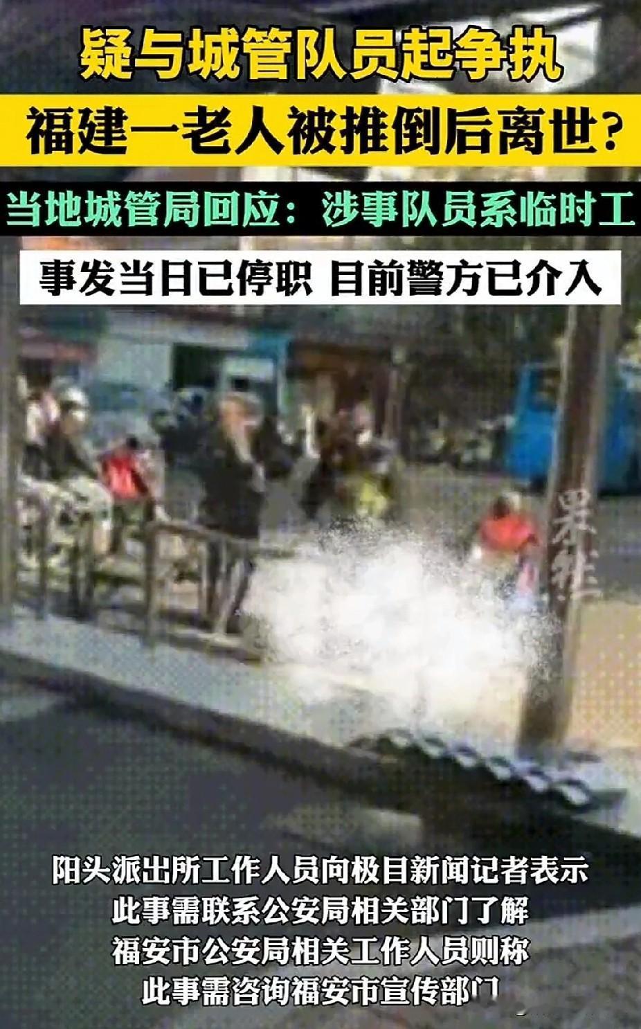 “又是临时工”!福建,老人疑与城管发生争执,被城管推倒后致死?城管局回应:涉事队员已被停职,是一名临时工。 近日,福建福安市有网友反应,一名老人疑与城管发生争执,被暴力推倒在地。 从网上流出的监控画面里,看得人后背发凉。 事发时间是12月21日,一名戴着黑色帽子的老人,佝偻着身子,慢悠悠从路边台阶走下来。 谁也没料到,一名穿着城管制服的工作人员,竟然猛地快步迎上前,一个抬手,直接就将老人推倒在地上。 视频里,有名女士和我一样发出惊呼:“妈呀!” 视频到此戛然而止,可后续传来的消息,却让所有人的心沉到了谷底。 有附近商户老板称,老人被倒地后因伤势过重,最终还是没能挺过来,不幸离世了? 据12月25日的《果然视频》,事件持续发酵后,城管办公室工作人员回应,涉事人员系临时工,已被停职,关于老人是否去世?建议咨询公安机关。 目前,警方已介入调查。 评论区里,网友们义愤填膺,瞬间炸开了锅。 有网友说,每次都是熟悉的味道,一出事,背锅的永远都是临时工。 也有网友反驳,出大事了就是临时工,有功劳那就不是临时工了,谁都不是傻子。 毫无疑问,这样的吐槽,狠狠戳中了无数人的痛点。 依据相关规定,临时工不应该具备单独执法的资格,只能从事辅助性工作。 可为什么,每次发生类似事件,“临时工”总会成为“挡箭牌”? 让大家真正愤怒的,从来不是“临时工”这个身份,而是这背后赤裸裸的“甩锅”。 写在最后 想起一句话:身上若无千斤担,谁愿拿命赌明天? 这句话,道尽了多少来自底层人的无奈和心酸! 作为一个合格的城市管理者,面对年迈的老人时,应该多一份耐心和包容。 哪怕规定再严格,也应该对生命存在敬畏之心,而不是直接“一刀切”。 权力一旦落入流氓之手,将是人民的灭顶之灾! 真相未出之前,期待警方来个大快人心的后续,能够彻查到底,还老人一个公道。 关于这件事情,你怎么看呢? 消息来源于《果然视频》