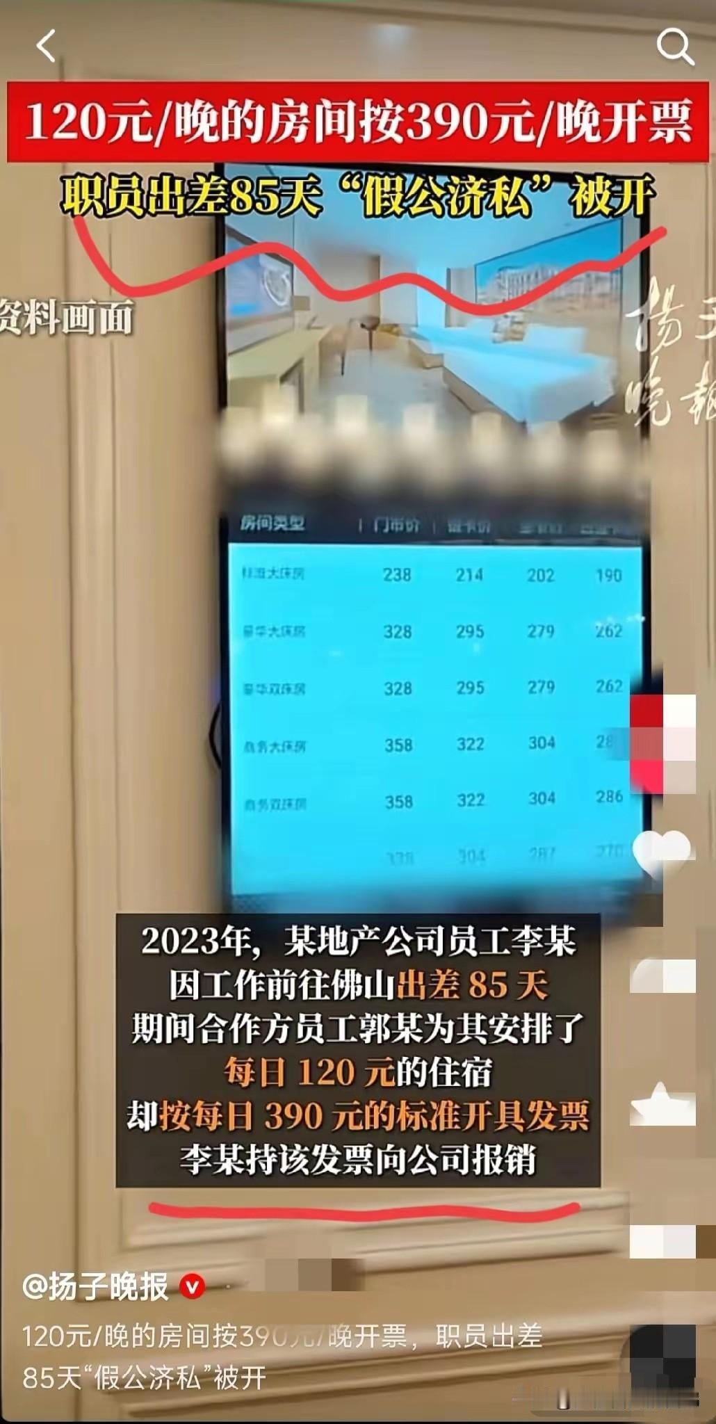 这哥们真是把我也给整乐了, 南京一哥们出差85天,凭本事把公司住宿标准从400的四星级酒店,改成住120的小旅馆,开390的发票。 虽然这哥们贪了差价,但厉害了,这哥们省了10块钱。省了10块钱还被举报了,财务查账查出后,公司高层很生气,说不讲诚信,居然贪小便宜,决定以后出差住宿改为“实报实销”。 一算账,这一改一年要多花几十万,公司高层本想堵员工的漏洞,让大家出差住好一点,没想到却让大家出差舒服多了,而公司却成了冤大头。 麻烦看官老爷们右上角点击一下“关注”,既方便您进行讨论和分享,又能给您带来不一样的参与感,感谢您的支持!