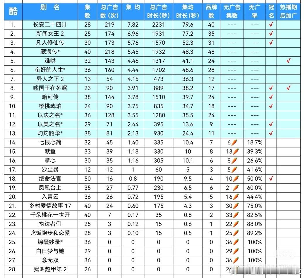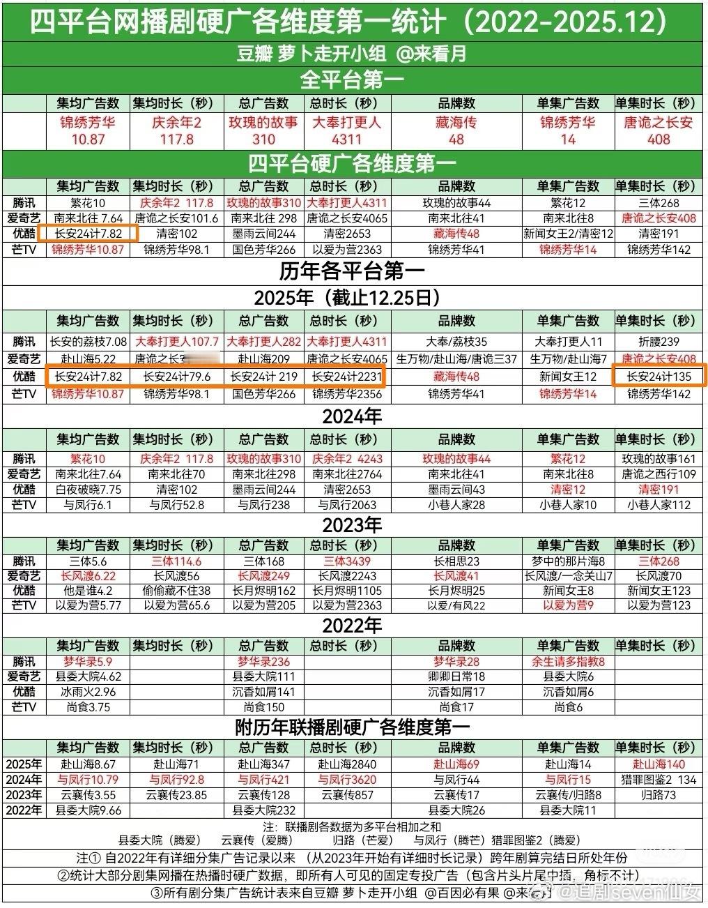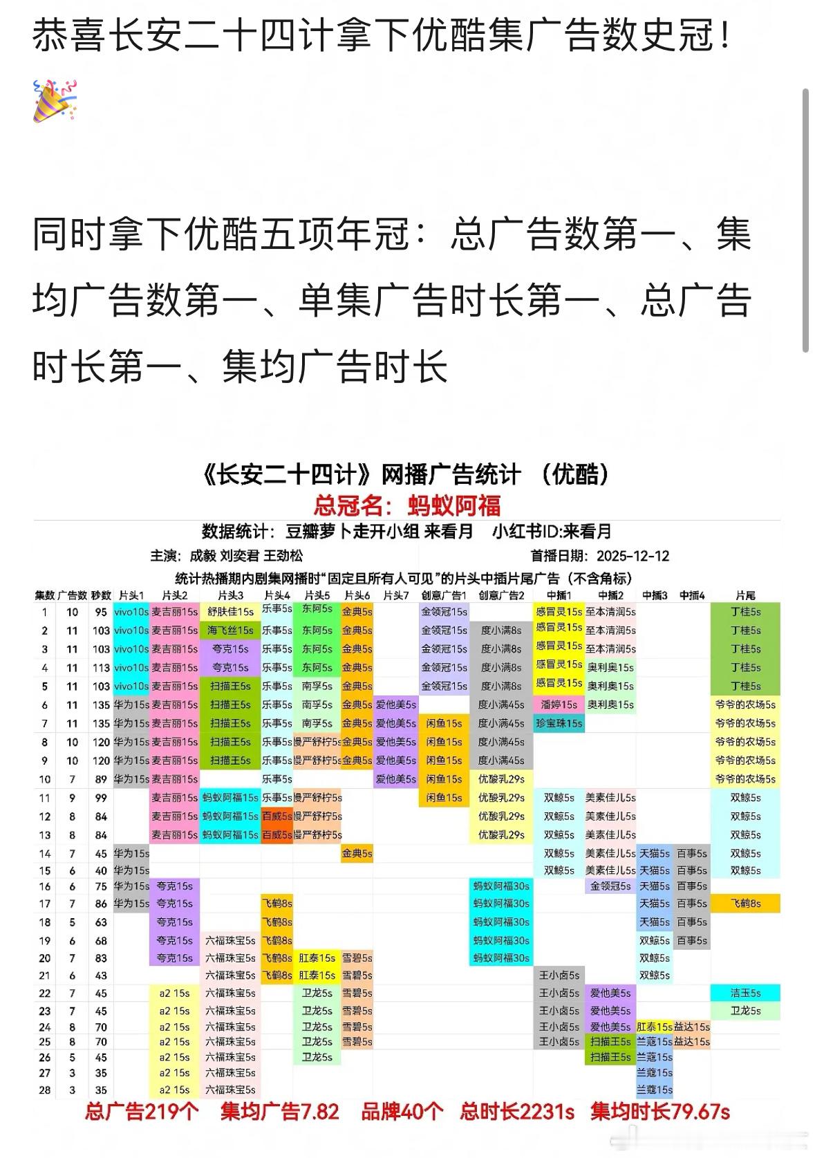 长安二十四计全集有广,并创优酷剧集集均广告数历史史冠,同时横扫优酷五项年冠:总广告数第一、集均广告数第一、单集广告时长第一、总广告时长第一、集均广告时长第一,优酷近两年唯一一部有总冠➕特约赞助的剧集,招商太强了,才28集体量➕无IP男频➕原创剧集,未参加优酷招商会,招商成绩在25年末创下行业纪录,果然是业内认可的黑马爆剧,成毅的商业号召力有目共睹,实在伟大