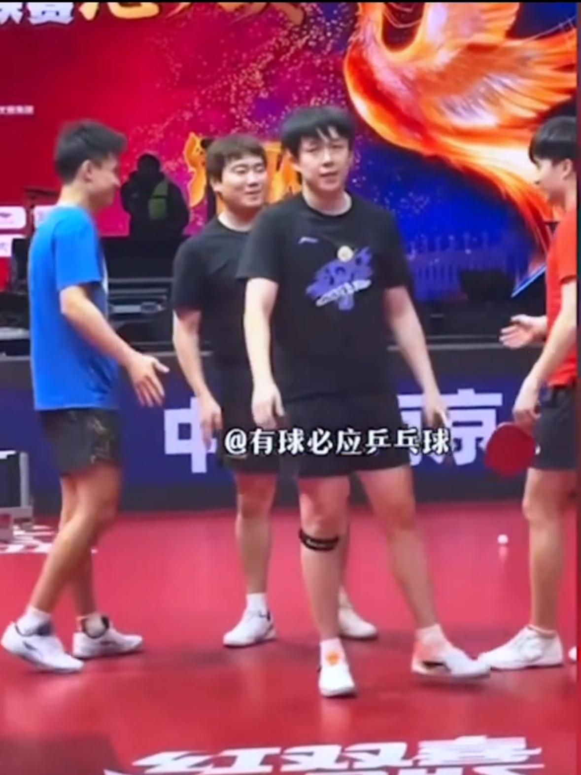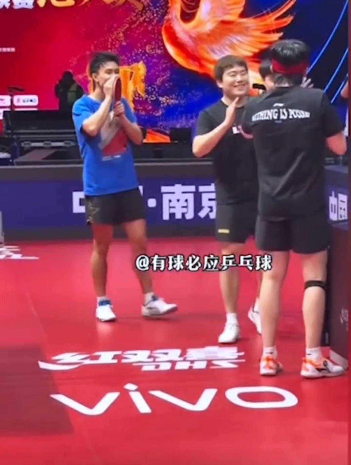 王楚钦拍完这个,拍我的,头哥和大胖是真好,自然而然,其实无论在哪里训练,身边总有兄弟在,莫大的幸福! 哈哈下班开心,小孩子要飞起来了,相互拍手,这是一种礼仪,乒乓球之间的友谊,大家都很欢乐,你们是我们也是,健康涨球,王楚钦和大胖他们一起,快乐打球!