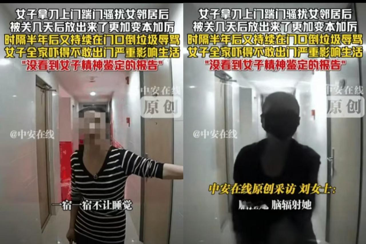 新房变牢笼!邻居持刀砍门还倒垃圾辱骂,精神病不是伤人的挡箭牌 辽宁刘女士满心欢喜搬进二手房,谁能想到,这竟是一场长达三个月的噩梦开端! 深夜熟睡时,突然传来砰砰砸门声,点开监控的瞬间,她浑身冒冷汗——女邻居正举着菜刀疯狂砍门!报警后对方被关几天就放出,报复来得更凶狠:门口被倒满烂菜叶、塑料袋,一开门恶臭直钻屋里;更过分的是,邻居天天堵在门口扯着嗓子辱骂,污言秽语夹着恶毒诅咒,听得人头皮发麻。 离谱的是,这一切的起因,竟是邻居臆想自己被“脑辐射”,还一口咬定辐射源就是刘女士家! 三个多月里,刘女士全家吓得不敢出门,吃不好睡不香,好好的新家硬生生变成了牢笼。报警多次,换来的只有口头教育和“别正面冲突”的建议,对方反而变本加厉。 好在警方终于立案,还送邻居去做精神鉴定,可报告迟迟没下文,骚扰也没断过。 我们同情精神障碍患者的身不由己,也理解他们需要社会关怀,但同情绝不是纵容伤害的理由!患者的权益要保障,无辜者的安全更不能被忽视。凭什么要让受害者独自承受恐惧?“可能有精神病”,从来都不是伤人的挡箭牌! 女子拿刀上门骚扰 邻居全家不敢出门