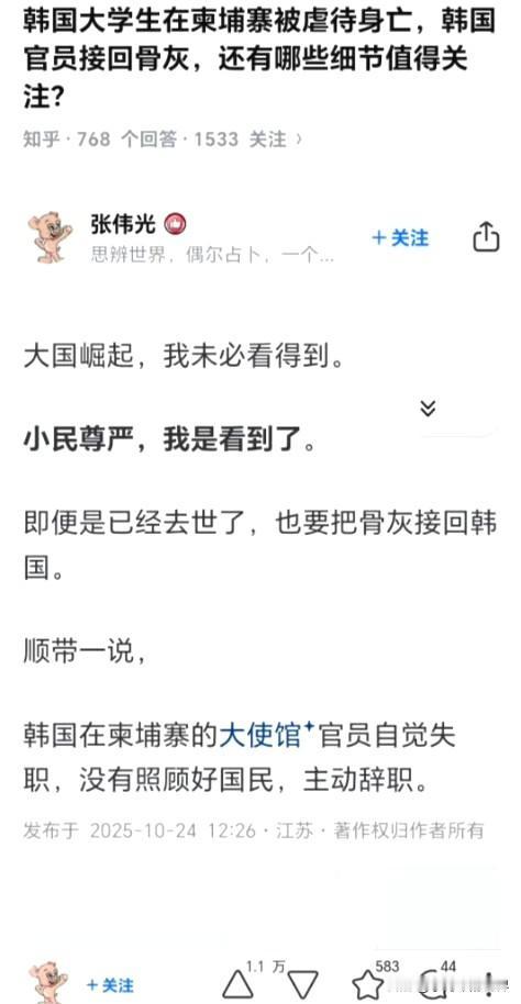 韩国大学生在柬埔寨被虐身亡,韩国官员接回骨灰,下面评论韩国是亚洲之光。 还说什么,大国崛起,我未必看得到,但小民尊严,他看到了。 称赞韩国,一个把人民生命财产放在首位的国家,值得世界尊重。 待凡他去趟韩国,也说不出这么就连韩国人听了都脸红的无脑话。 说什么韩国大使馆官员因为这个事,觉得自己做的不到位,主动辞职。 什么时候韩国官员的辞职是“某乎”上网友说了算? 韩国就是接个骨灰回来都被这些人夸上天。 然而,这些人却只字不提那个韩国财阀千金的事,这位韩国女子从09年就涉毒,一直折腾到2025年,才落网,还不是在韩国被抓的,而是在柬埔寨落网的。 这位千金从09年涉毒,19年被抓,2022年又被抓,23年潜逃泰国,25年参与电诈洗钱,在柬埔寨才被抓。 如果这是个韩国普通人,你觉得她能折腾这么久? 参与电诈洗钱,也就是说,她可能也参与了把韩国人骗到柬埔寨园区榨钱,那个在柬埔寨被虐待身亡的韩国大学生会不会跟这位有关?
