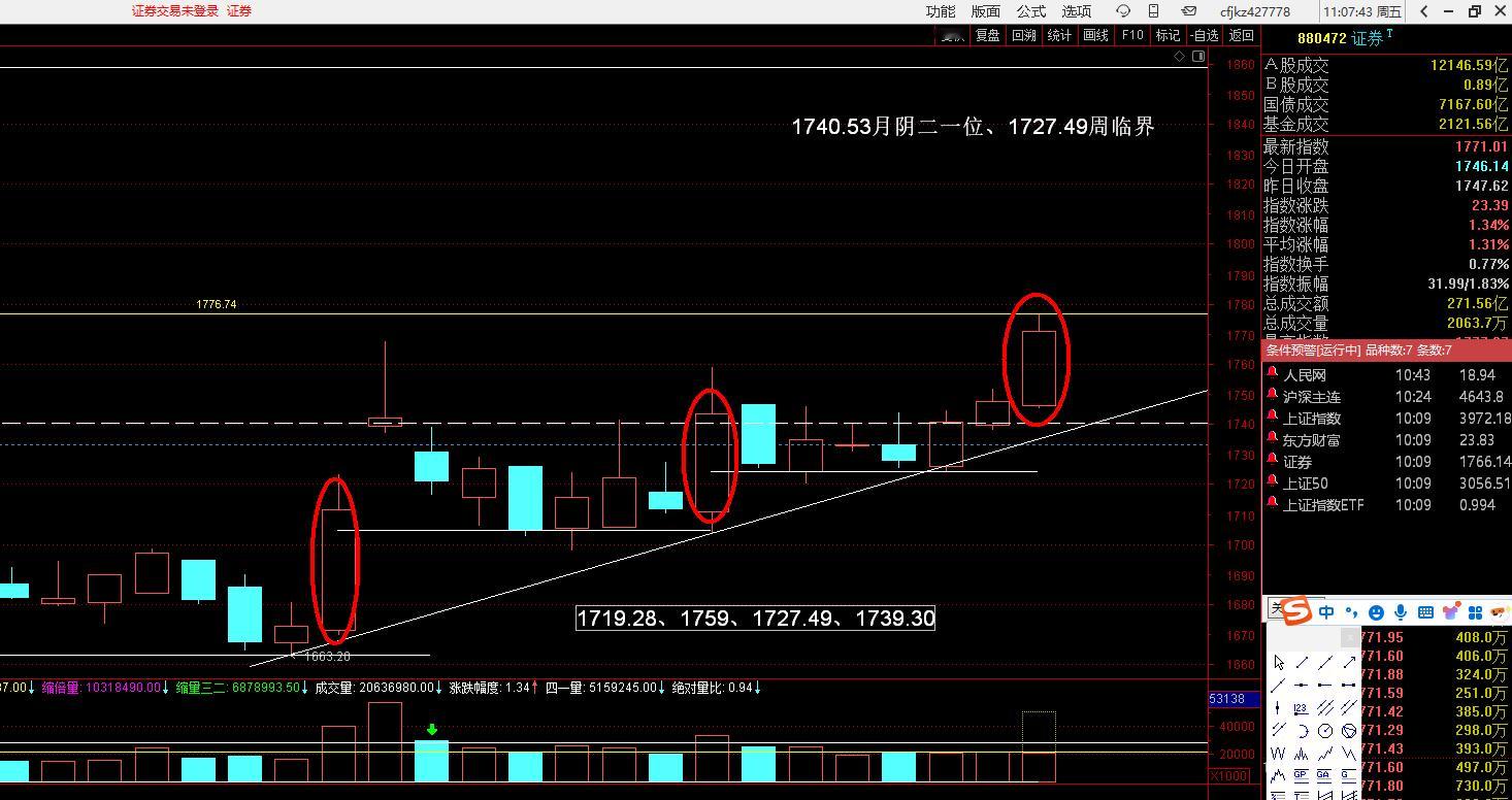 复盘方法全部用现在置顶的视频证券指数周线起来有4个阴线的临界点分别是11月21日的周线大阴二一位1719.28和实顶1759.00,这是左侧的阴线然后是12月12日的右侧周假阴的二一位1727.49和实顶1739.30,这是右侧的阴线然后把4个位置1719.28、1759、1727.49、1739.30移植到日象,再画线,看都是哪些阳柱用飘龙波、推升波站稳了这些位置,这些价柱是否自称王牌的基柱1、最后一次站稳1719.28,是12月17日的价柱(这天也同步站稳1727.49和1739.30),开盘1710.69,收盘1743.58,尾盘拉飘龙,三日定性为将军柱的换挡,前面12月5日是黄金柱的刹车,这是两级金阶。2、今天的价柱开盘1746.14,当前最新1771.37,盘中打过了1759,那么就可以先把今天看做是加油的基柱,第三级的基柱,但需要三日确认,即下周1、2、3,如果到下周3,正好是月最后一天,能站稳今天的收盘点位以上,则是一个质量很好的三级构建,最好是能够站稳1791.32以上,是月大阴实顶。如果满足,则证券指数国家队他们反转了,今年一年,我只在7月说过一次证券的月线反转,那个时候还不是很多人迷茫,我只看信号形态、金阶构建做出来了没有。