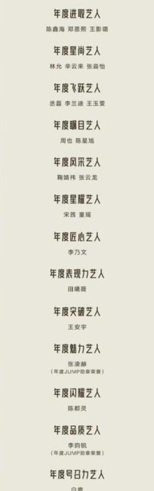 星光大赏的奖项演员和艺人分的很清楚 流量艺人拿的个人奖项几乎全是年度**艺人,为数不多几个流量给了演员奖项,都会带着人气和星光,受欢迎,突破,潜力等前缀,请来的一些稍微实力派的演员拿的奖都是年度**演员,流量艺人这边最大的奖就是赵露思的年度影响力艺人。