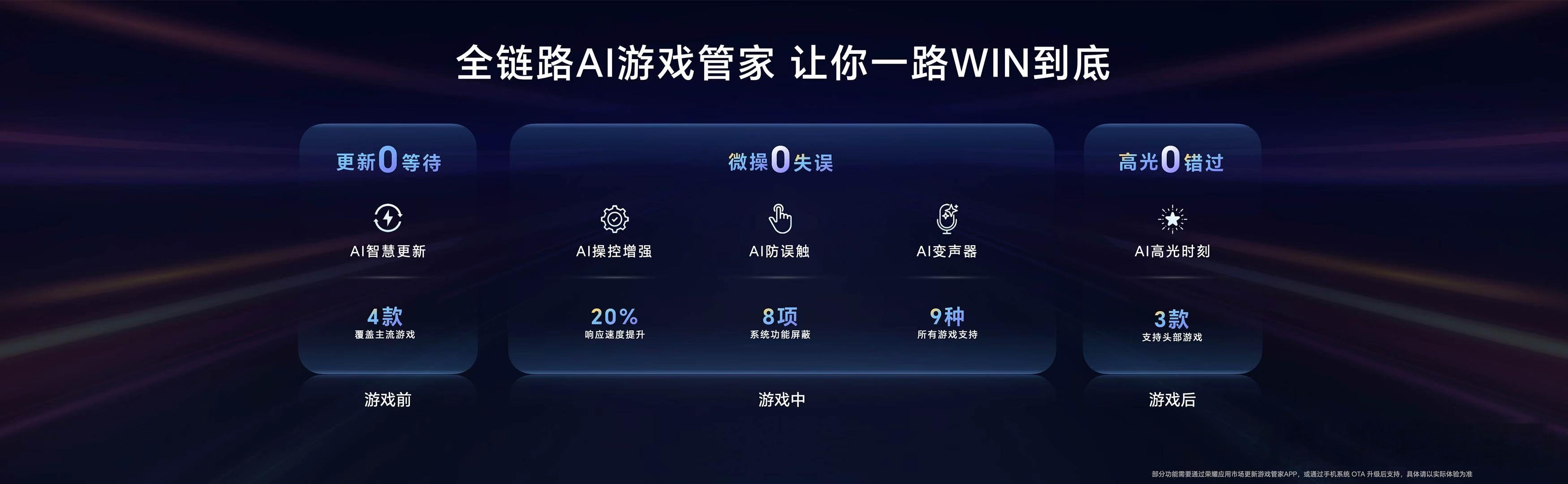 荣耀WIN系列带来了行业领先的通信和影像配置,以及更智能、全面的游戏方式,全系搭载荣耀鸿燕AI通信系统,24根环绕天线、抢网Wi-Fi电竞芯片,以及校园网专项优化等,全方位保障用户的通信体验。5000万微单级写真主摄,更有旗舰同款LivePhoto,运动场景轻松记录分享。全链路AI游戏管家,五大AI功能,助力玩家一路“WIN”到底。荣耀WIN系列还可以联合盖世游戏应用加亲选手柄,多种模式畅玩PC游戏,体验拉满!荣耀WIN荣耀发布会荣耀WIN年度电竞最夯机
