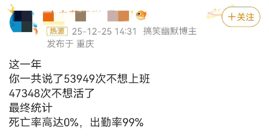 哈哈哈哈,打工人现状: 骂骂咧咧地干活, 抠抠搜搜地花钱, 小心翼翼地犯错, 每天想辞职千百遍, 月月拿全勤, 年会上唱感恩的心![捂脸] 最近今年上班出勤率99% 话题刷屏,看完直接笑到拍桌——这说的不就是我本人吗! 每天闹钟一响,先在心里把上班骂八百遍,骂完麻溜洗漱;干活时对着报表吐槽老板画的饼比脸还大,手上敲键盘的速度却没慢半分;发工资前抠抠搜搜算房租水电,发薪日秒变“月光族”,主打一个“赚多少花多少”的通透。 开会时大气不敢喘,生怕被点名批评,转头就和同事吐槽“这班是一天也不想上了”。可是可是,嘴上喊着辞职喊了365天,月月全勤从没落下。 到了年会更绝,前一秒还在和同事吐槽,后一秒跟着音乐唱《感恩的心》,表情比谁都真诚。我们这届打工人的生存哲学就是:用吐槽释放压力,用满勤守护底气,毕竟在就业环境波动的当下,稳定上班也是一种幸福呀。😊 其实99%的出勤率,藏的不是内卷,是打工人的通透——吐槽归吐槽,生活要继续,工作要认真。毕竟骂完老板、吃完火锅,第二天又是元气满满的打工人! 你今年的出勤率多少?有没有“日均想辞职100次,却拿满全勤”的同款经历?评论区晒出你的考勤故事! 打工人的日常 年度总结 职场生存指南