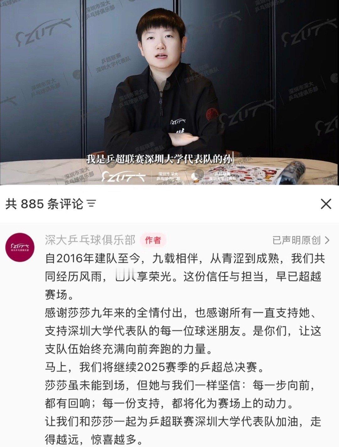 12月26日乒超女团半决赛,孙颖莎因左脚踝韧带慢性劳损+足底筋膜炎,遵医嘱休养8周无缘出战。她录视频为深大加油,未随队赴南京,球队重担落蒯曼、平野美宇等肩上。