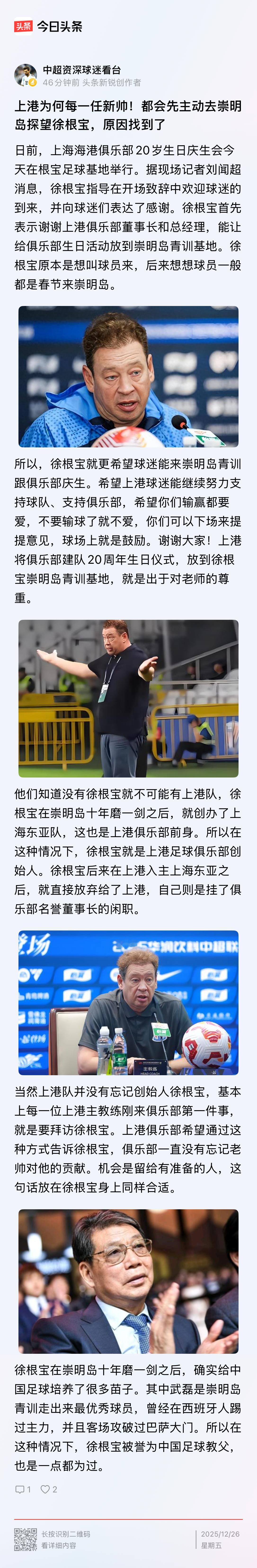 上海海港20周年庆生活动落地徐根宝崇明岛青训基地,源于对其创始者身份的尊重。徐根宝创办的上海东亚队是上港前身,他后将球队交由上港并任名誉董事长。上港历任新帅上任首件事便是拜访他,以此铭记其为球队奠定的根基与青训贡献。