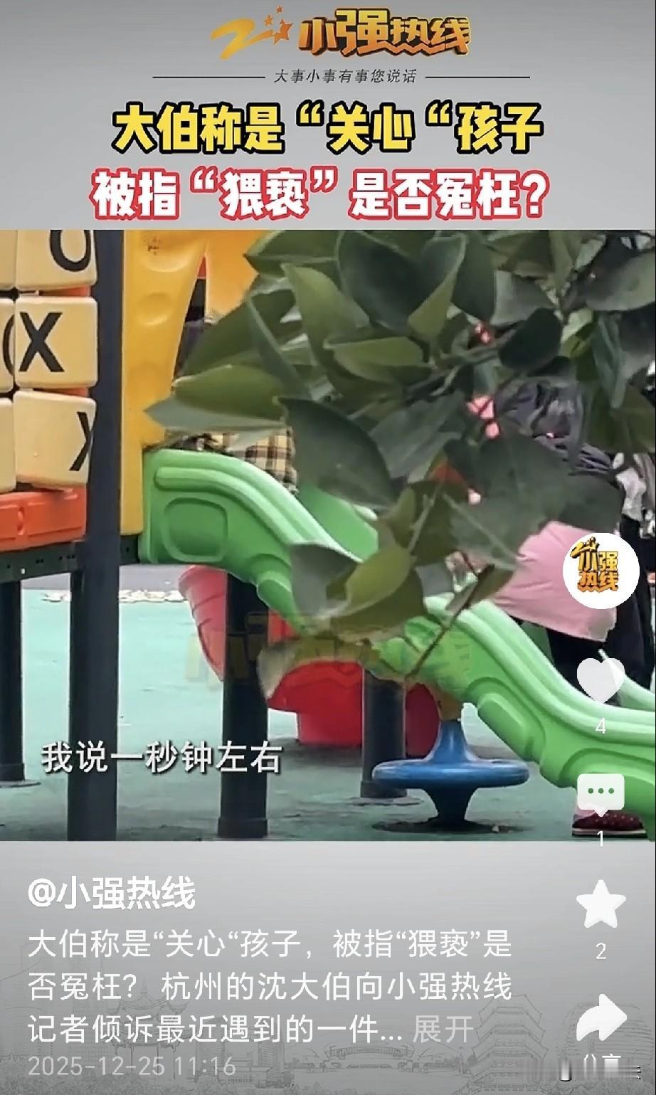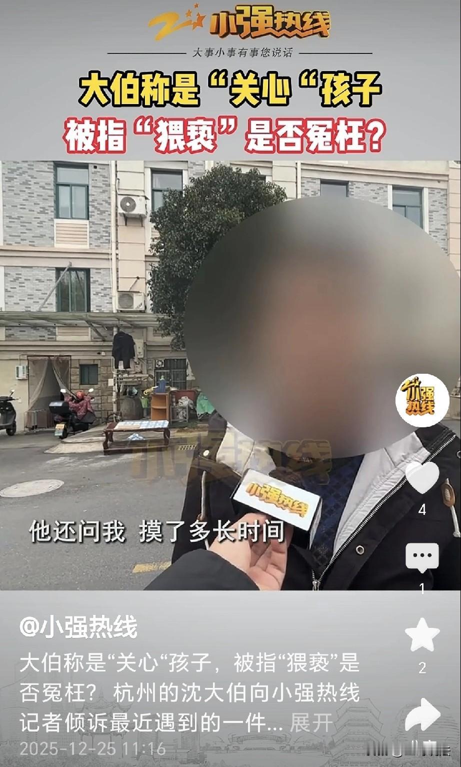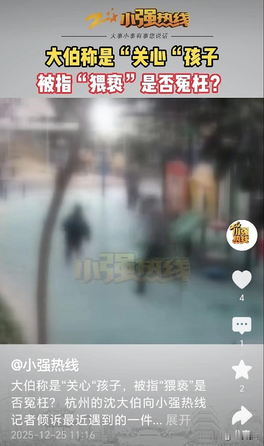 闹大了! 浙江杭州,一小男孩和7岁的女孩在楼下游乐场玩,男孩爷爷看他们满头大汗,怕孩子受凉感冒,伸手在俩孩子背上摸了一下,万万没有想到,到了晚上,女孩家长找上门来,说男孩爷爷“猥·亵”女儿,家长报警,和爷爷没完,爷爷懵了,我是摸孩子后背了,就是怕出汗感冒,也就1秒钟时间,难道好心还有罪了?网友: 那以后握手是不是也不能握了? 沈大爷洗漱完毕,照顾自己的小孙子睡下,可是这时,门口传来一阵敲门声音。 大爷开门一看,是附近的邻居,他们之间并不熟悉,大爷问他们有什么事情。 谁知对方说大爷猥·亵了他们7岁的女儿,大爷懵了,此话怎讲?你们的孩子到底咋了? 原来,12月5号傍晚,大爷高高兴兴,带着孙子在游乐场玩耍。 孙子年幼,到了游乐场里,不大一会,就和邻居家7岁的小女孩玩到了一块。 孩子们天真可爱,他们高兴的边跑边跳,一会在滑梯上跑上跑下,一会又你追我赶,时不时发出大声的笑。 沈大爷在一旁看着,不由得被孩子们的快乐感染了情绪,他带着微笑,看着孩子们不断的奔跑。 可天慢慢黑了,温度也已经下降,12月份的天气,早就到了穿棉衣的时候。 孙子满头大汗,时不时会回到沈大爷的旁边,沈大爷看到孙子一脑袋的汗水,他轻抚了一下,又怕孙子着了寒凉。 那7岁的小女孩也和孙子站在一块,沈大爷摸了一下孙子后背,也在小女孩后背上摸了一下。 他原本是怕,孩子出汗多了,再被凉风一吹,如果感冒,那就麻烦了。 之后,孩子们又玩了一会,沈大爷就带着孙子回家,他给孩子洗漱了一遍,叮咛孩子早些睡下。 可是他万万没有想到,他无意中的的这个举动,给他带来了巨大的后患。 沈大爷看下时间,已经晚了,他坐下休息,谁知这时,大门被敲响了。 沈大爷打开了大门,邻居立刻气势汹汹,对他一顿指责,说他摸了女儿的后背,猥·亵了他家的7岁的女儿。 这就是开头的那一幕,邻居还表示,他们已经拨打了报警电话。 沈大爷哭笑不得,这是哪跟哪呀,我是摸了孩子的后背,可是摸那一下,是看孩子背上有没有汗。 如今天气凉了,我就是怕孩子们出汗受凉,万一感冒,孩子们又得吃药受罪。 可是女孩家长不同,认为大爷这是狡 辩,你摸你家孙子可以,你不能摸我家的女儿。 你既然摸了,肯定就是有意为之,你这就是猥·亵我家孩子,这事不能就这么完了。 大爷来到了派出所里,面对警方询问,大爷坚持自己的说法。 大爷表示,我摸孩子后背,不过就是怕出汗着凉,民警又问,问大爷摸了多长的时间。 大爷有些气恼,我就摸了一下,能用多长时间,也就一秒钟,主要就是怕孩子背上出汗,那样就会着凉感冒。 随后,警方要沈大爷签字,沈大爷一看,上面白纸黑字,写着“疑 似 猥·亵”,签完字后,还拍了照片。 大爷百思不得其解,我摸孩子后背,担心孩子着凉感冒,难道好心,还有了罪了? 如果她孩子没和我孙子在一起玩,也就不会有这场事,我孙子的后背我也摸了,我就只是当他们是孩子。 警方提出,要大爷配合调查,大爷一口咬定,自己并没有猥·亵小女孩。 再说,她只有7岁,和我孙子年纪相仿,既然和孙子一起玩耍,我好心管她,怎么还管出事了? 大爷越想越气,自己一把年纪,清白不能毁了,他找到记者,想要记者帮助自己。 沈大爷调出自家监控,刚好可以看到小区的游乐场附近。 视频里显示,沈大伯的孙子和小女孩在游乐场里玩着。 到了下午,大概在5点多的时候,大爷家做好了饭,着急叫孩子回家吃了再玩。 可是孙子听到喊声,并不想回家,孙子调皮,又在滑梯周围跑了几圈。 沈大爷边喊边追,孙子腿脚伶俐,跑的太快,监控设置的是近距离拍摄,视频里渐渐看不到了他们。 后面发生了什么,不得而知,记者去找小女孩的父母,可对方只是租户,他们没在家里,房东也没他们的联系方式。 小区工作人员回复,已经把公 共视频交给了警方,也对小女孩家长做了工作。 之前家长态度强硬,他们也能理解,毕竟是心疼自己的女儿。 目前来说,家长的态度已经缓和,警方也在积极调查,会根据事实依法做出处理决定。 有人认为,大概率是冤枉了大爷,做过家长的都该知道,孩子脑袋上有汗不怕,就怕背上有汗,就会着凉。 也有人说,那你摸自己的孩子就行,不应该摸别人的孩子,如果是男孩还情有可原,人家是女孩就不该这样。 可要真是坏人,就不会仅仅只是摸背了,摸一下后背都怀疑是猥·亵,那以后握手是不是也不能握了? 《治安管理处罚法》第44条规定:猥·亵不满14周岁的人或者有其他严重情节的,处10日以上15日以下拘留 。 沈大爷摸女孩后背仅1秒,主观是担心孩子出汗着凉,无任何其他目的。 大爷仅触碰小女孩后背,无任何其他过分的举动,且结合监控与场景,并不符合猥.亵举动。 目前警方还在调查,将会按照实际情况处理事件。 对此,你怎么看?欢迎评论区留言讨论。 关注@王哥说法 多学法律少吃亏