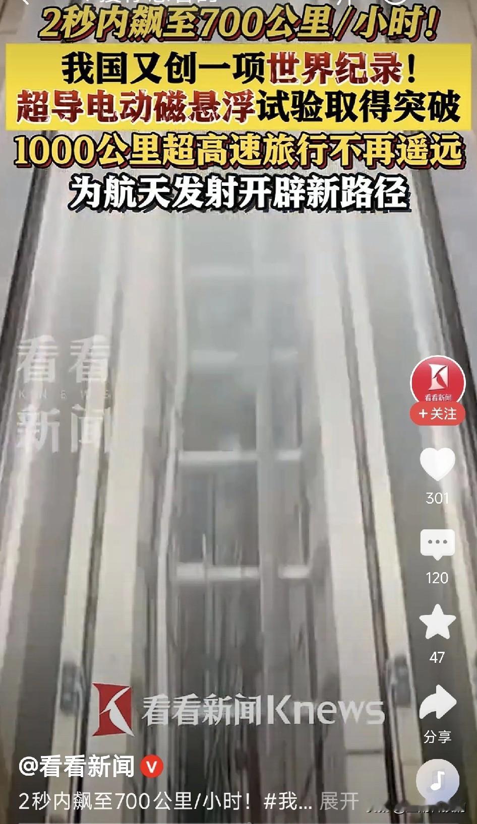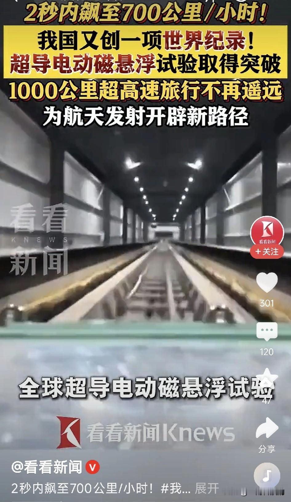 谁能想到,陆地交通工具也能跑出“火箭级”速度,2秒飙700km/h! 国防科大磁浮团队刚创下全球新纪录——一吨重的试验车,2秒内从0加速到700公里/小时,还能稳稳停下,直接把日本之前保持的603km/h纪录甩在身后。 2秒也就够眨两次眼,这台车已经“飞”出近200米,比高铁启动快10倍不止。700km/h是什么概念?是复兴号高铁的2倍,接近飞机巡航速度,却不用受天气影响,也不用提前候机。更绝的是,这不是小模型炫技,是实打实能拉货载人的吨级试验车,安全性和稳定性都过了硬关。 这可不是单纯“比速度”,这背后藏着改变未来的大玄机。超导磁浮的核心技术,既能让未来真空管道磁浮突破1000km/h,实现北京到上海1小时直达;还能助力航天发射,让火箭发射成本大降30%。现在的突破,相当于给我国超高速交通、航空航天产业装了“加速器”。 真是厉害了!以前总觉得“瞬移”是科幻情节,现在中国科研团队用技术把梦想照进现实。从高铁领跑全球到磁浮再破纪录,咱们的交通科技不仅在追光,还在成为光。未来几年,城际磁浮示范线就要落地,说不定很快就能体验“坐火车比坐飞机还快”的快乐,大家期待吗?