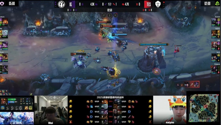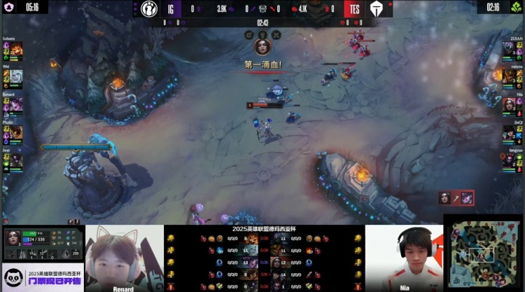 [5:25]上路TES双人组压线,naiyou皇子上路反蹲,Wei佛耶戈从河道来上,上路3v3,iG野辅瞬间被秒杀,JiaQi女警再拿一个人头,TES打出0换2。