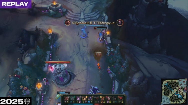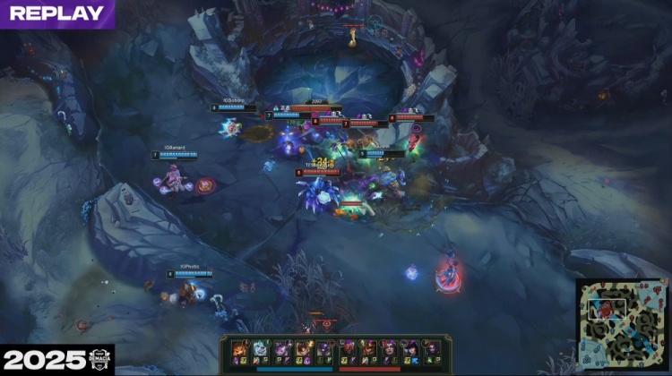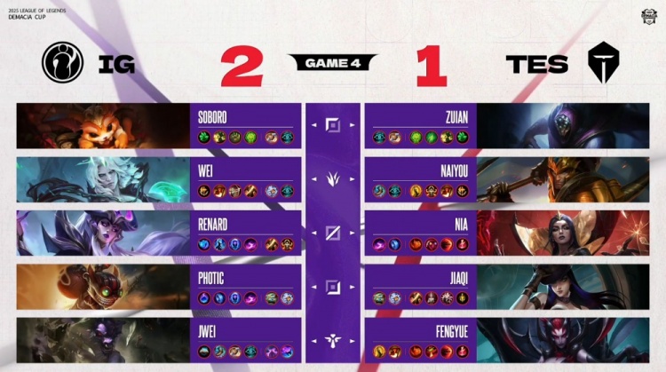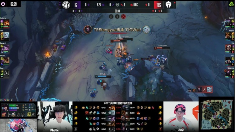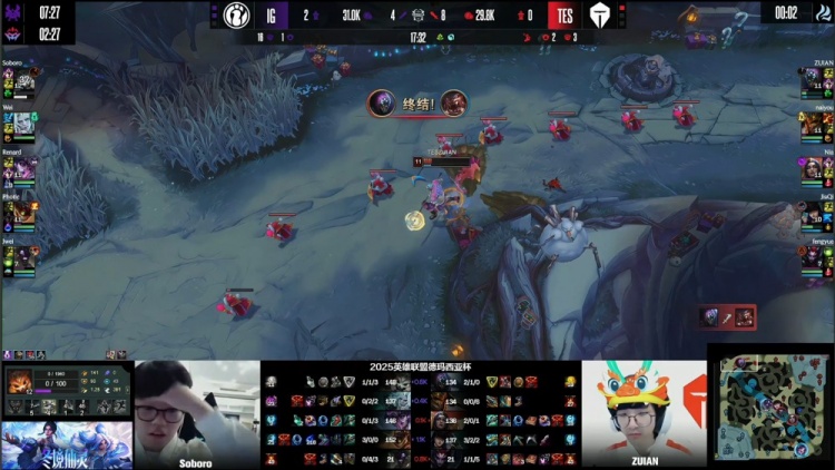 [25:41]iG轻松拿到大龙,经济领先1w1k。河道团战,fengyue蜘蛛吊钢丝落地就被秒杀,iG下路一波推上TES高地将其团灭,一波推平TES基地拿到比赛胜利淘汰TES!