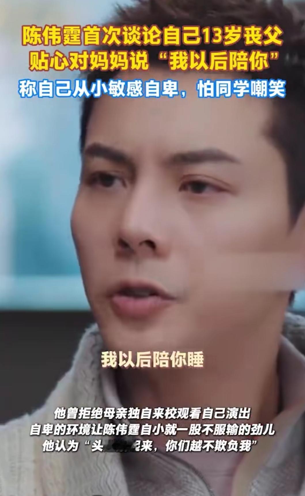 刷到陈伟霆谈13岁丧父的采访,他那句“我以后陪你睡”不仅是对母亲的承诺,更藏着原生家庭缺憾里,一个孩子被迫长大的无奈。本以为这份童年伤痛会成为他的枷锁,却没想到成了他学会爱与担当的起点。 丧父后的敏感自卑,让他怕同学的嘲笑,甚至拒绝母亲的校园探望,可母亲的陪伴成了他最坚实的后盾。这份来自家人的温柔支撑,让他从“抬头挺胸不被欺负”的倔强小孩,长成了能扛起家庭、守护爱人的男人。如今和何穗生子升级当爸,他也把这份温柔延续到了自己的小家庭里。 原生家庭的缺憾从不是人生的终点,陈伟霆的经历恰恰证明:那些受过的伤,会在家人的爱意里慢慢愈合;那些被迫扛起的责任,最终会变成守护所爱之人的力量。真正的成长,就是把童年的遗憾,活成未来的圆满。