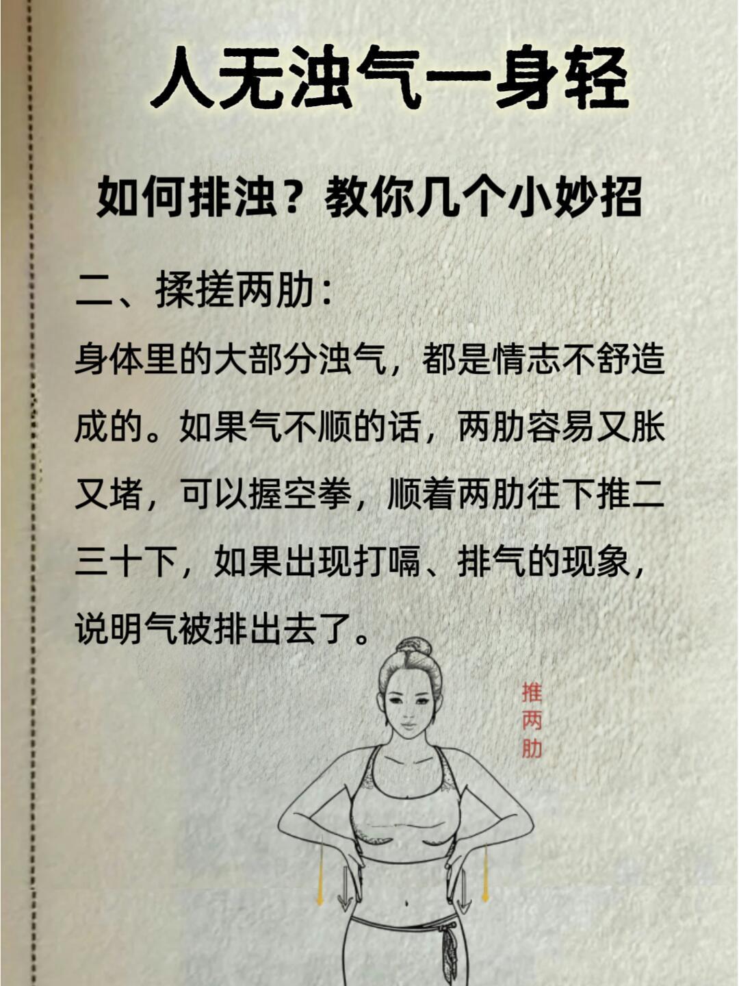 身体有“3浊”,不排百病生!冬天很多人喜欢吃一些滋补品,但是往往又缺乏运动,导致进补太多代谢不掉,这些“浊xie”就容易堵住脾胃运转不开,所以冬天身体容易积攒浊气、浊水、浊食这“三浊”,导致气血不畅,身体沉重。今天就来分享一个超简单的养生小妙招,每天推揉10分钟,帮你排出浊气,恢复气血,身体干净过冬哦~💪排浊气肚子胀气、💨、打嗝,都是浊气在作祟。试试这三个方法:敲膻中穴:握空拳轻轻捶打50-100下,这是身体的“出气口”,能敲走堵结。揉搓两肋:情志不舒会导致两肋胀堵,握空拳顺着两肋往下推二三十下,打嗝、排气就说明气排出啦。发“呼”音:多练hu音,排出脾中浊气。排浊水身体的痰浊、湿浊就是浊水,表现为小肚子、腹胀、咳痰、流鼻涕、眩晕、水肿、湿疹等。按揉阴陵泉穴和拍打八虚就能排出浊水哦。排浊物冬天吃油腻食物多,运动少,容易💩mi、肖化不良,口气重。饭后不要立刻躺下,可以靠墙蹲一会儿,或者用推腹法:手心搓热,双手重叠绕肚脐顺时针揉5分钟,再逆时针揉5分钟。还能🐔活肚脐的🌞气,帮助脾胃运化,排出寒湿污浊。每天晚上睡觉前和早上起床前揉一揉,心口闷堵就多推揉心窝,肚子🥩多就敲打,肝肾不好就推揉大腿根和小腹交接的三角区。揉完后,清气上升,浊气下降,身体就会轻松舒畅啦~💁 赶紧试试这个养生小妙招,让身体在冬天也能干净清爽,气🩸满满哦!微博中医药月