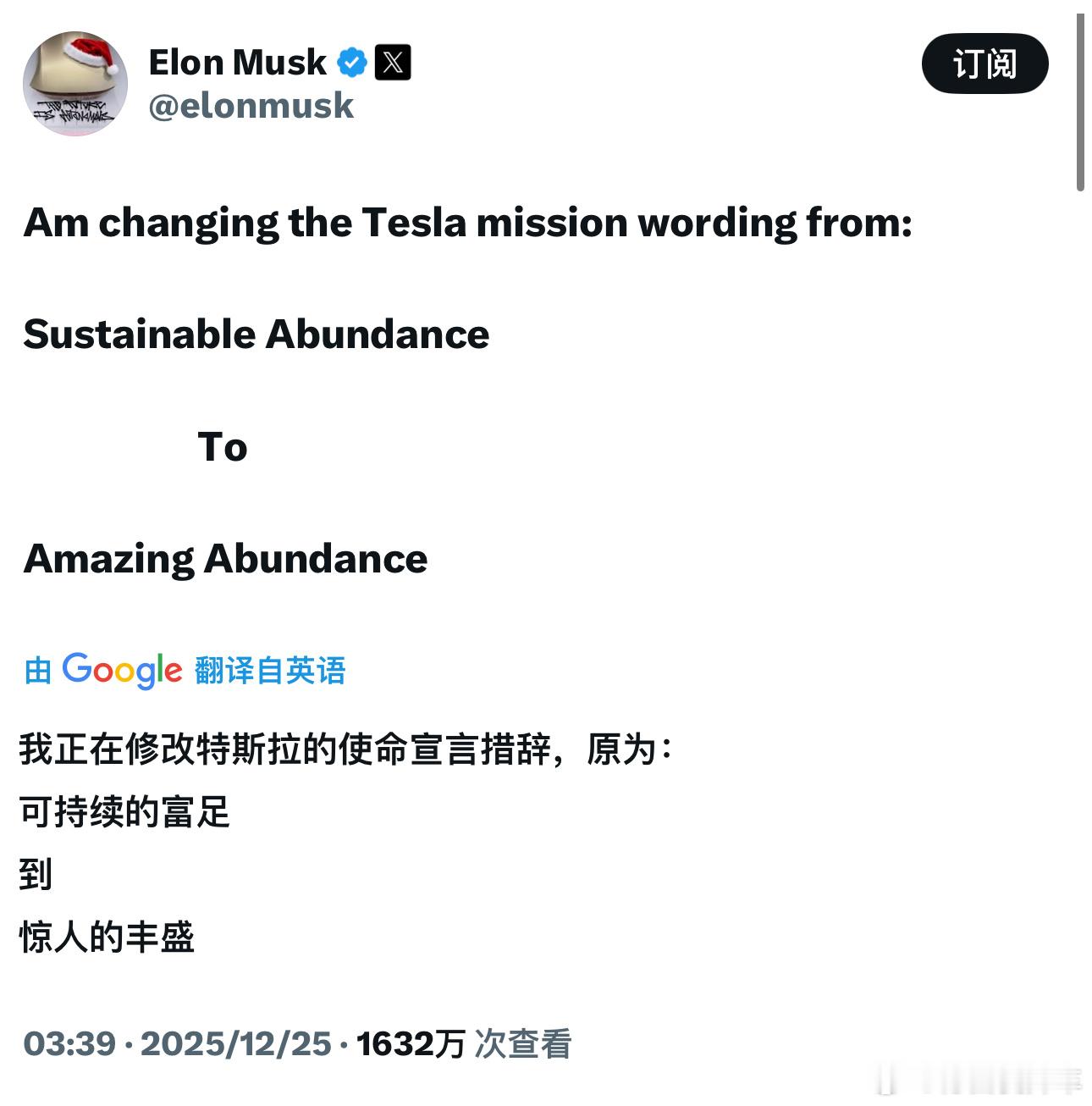 马斯克调整了特斯拉的使命,可持续的富足➡️惊人的富足;————马斯克认为 后者更令人喜悦;这更多是语气和营销上的调整。特斯拉