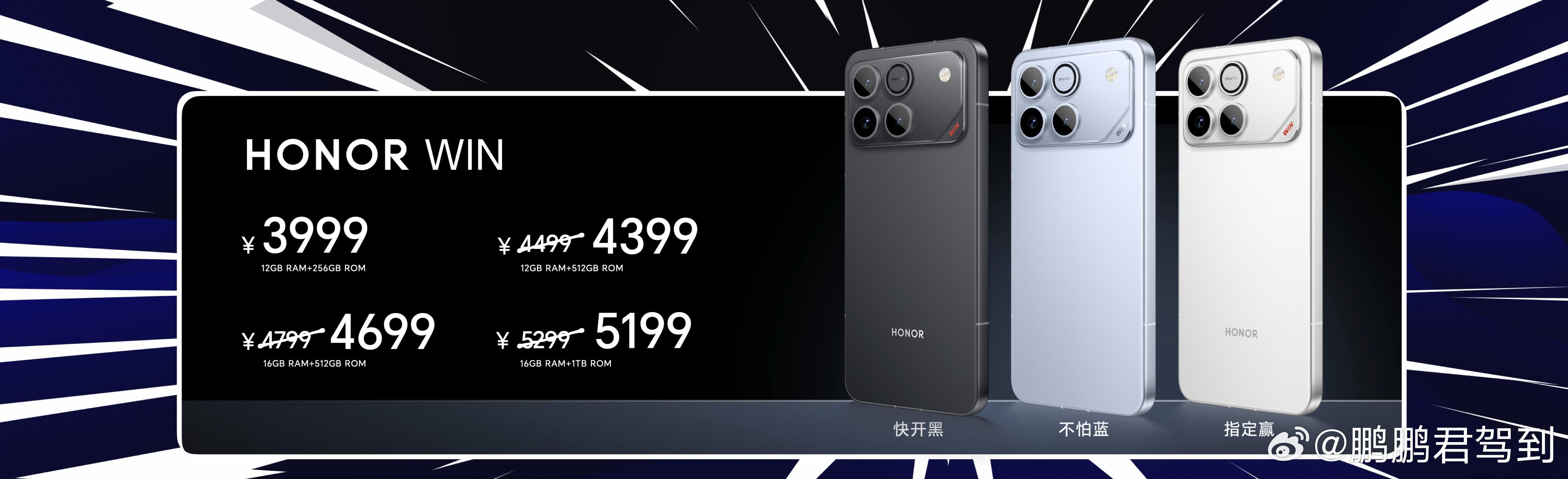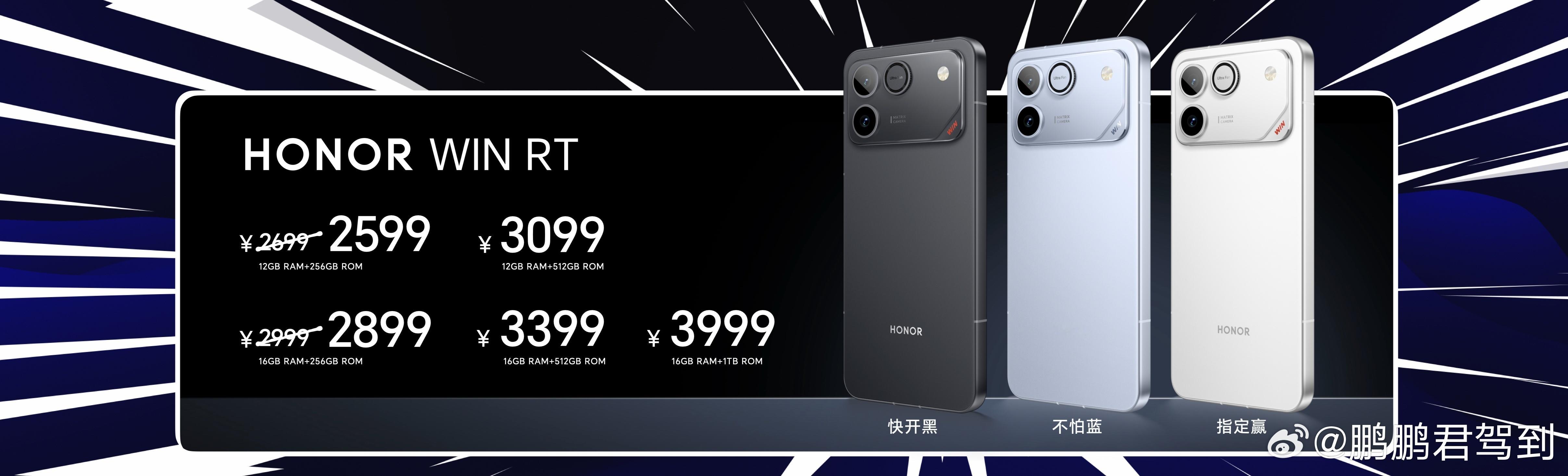 荣耀WIN系列价格公开,2599元起!共带来快开黑、不怕蓝、指定赢3款配色,现已全面开售,首销期间,共有总价值超过3829元的权益。上电商平台搜“荣耀WIN” 赢升杯赢免单,性能夯到顶,礼品赢麻了!荣耀WIN RT 12GB+256GB、16GB+256GB、12GB+512GB、16GB+512GB、16GB+1TB版本售价分别为2699元、2999元、3099元、3399元和3999元;荣耀WIN 12GB+256GB、12GB+512GB和16GB+512GB、16GB+1TB版本售价分别为3999元、4499元、4799元和5299元。 荣耀WIN荣耀WIN价格年度夯机荣耀WIN价格真香