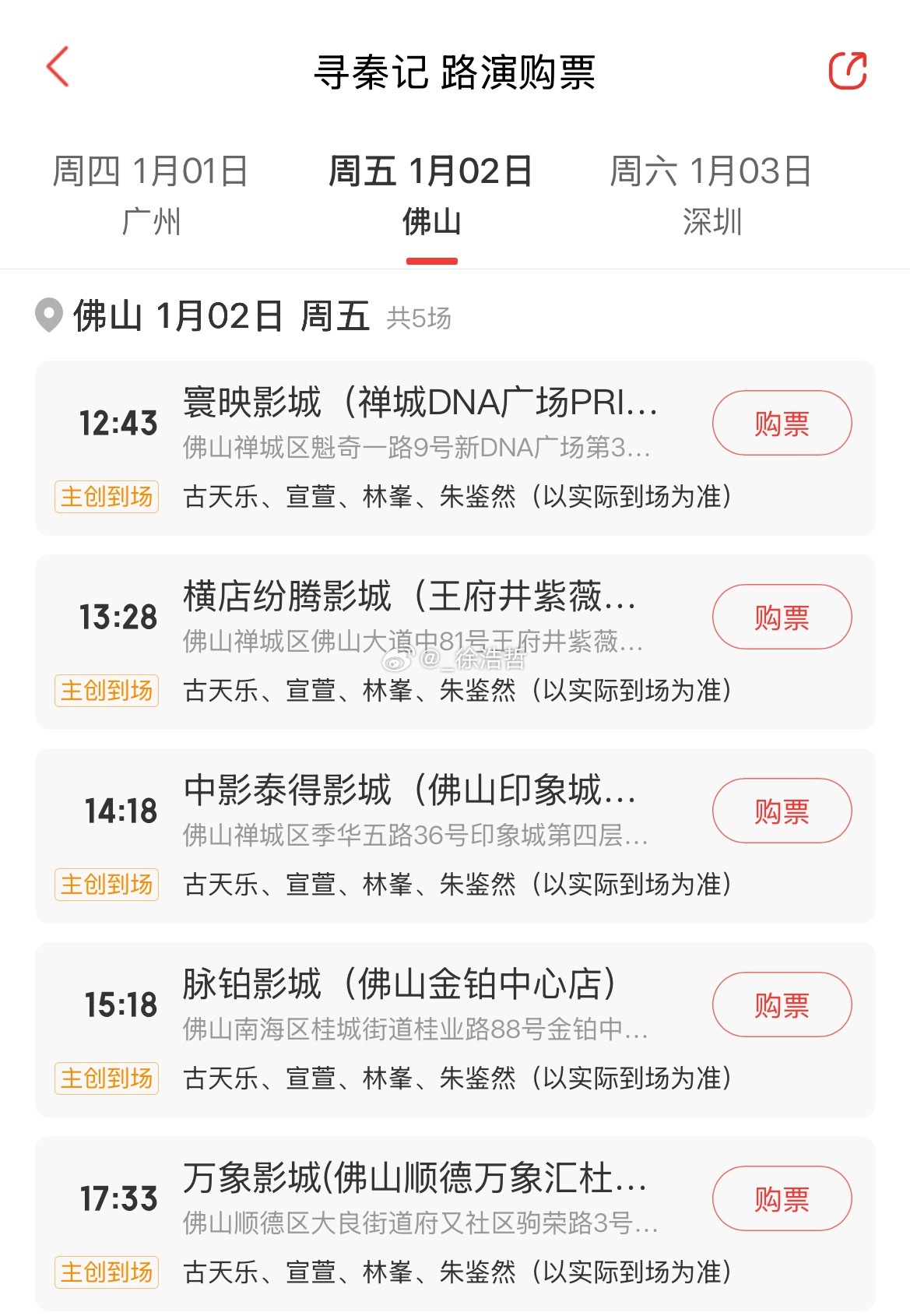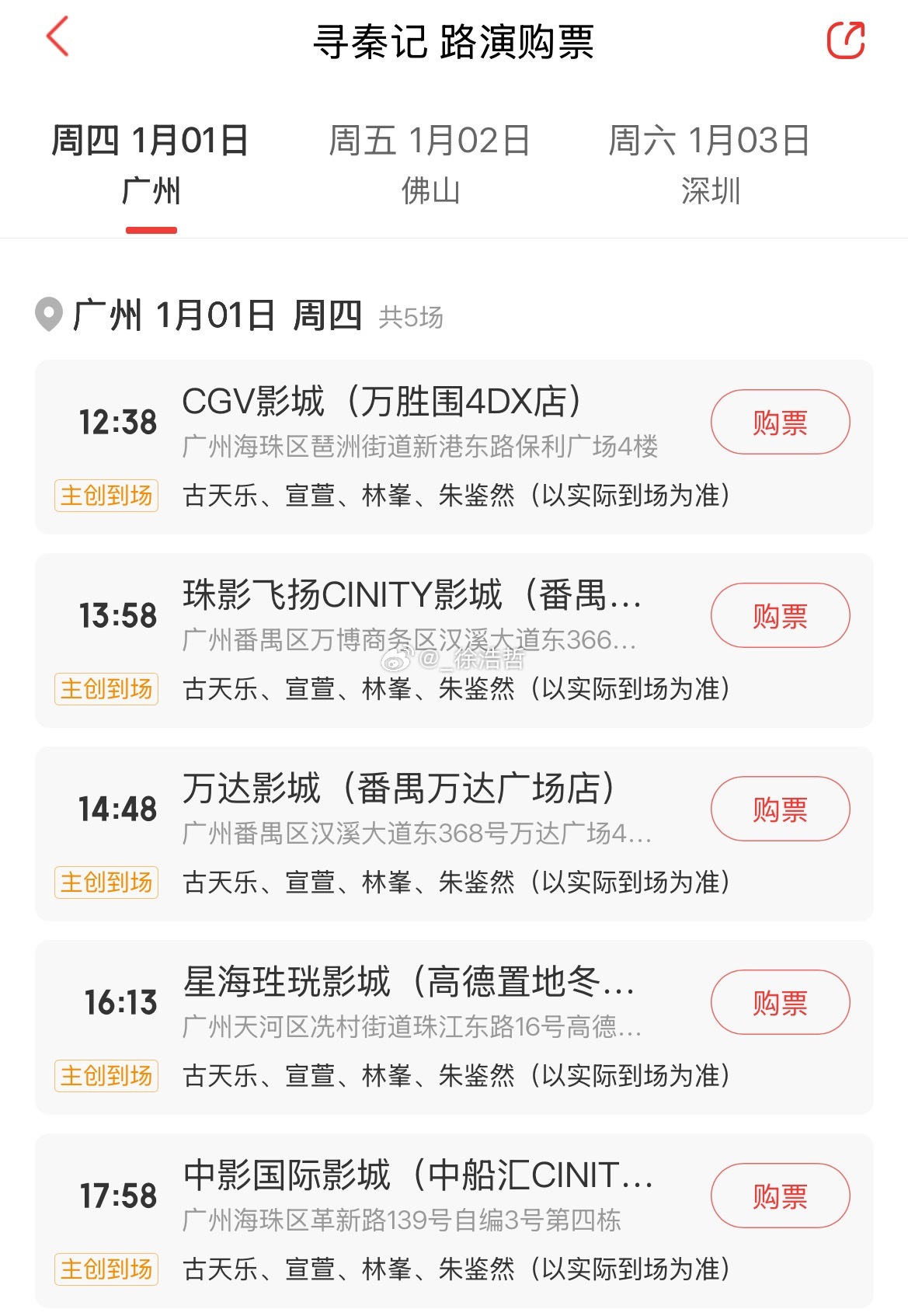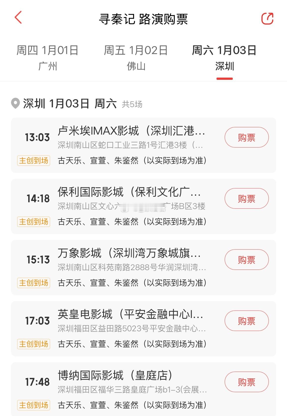 跨年电影愿电影寻秦记 电影《寻秦记》路演城市及影院如图所示映后到场主创如下2025.12.31 广州2026.1.1 广州 古天乐、宣萱、林峯、朱鉴然2026.1.2 佛山 古天乐、宣萱、林峯、朱鉴然2026.1.3 深圳 古天乐、宣萱、朱鉴然