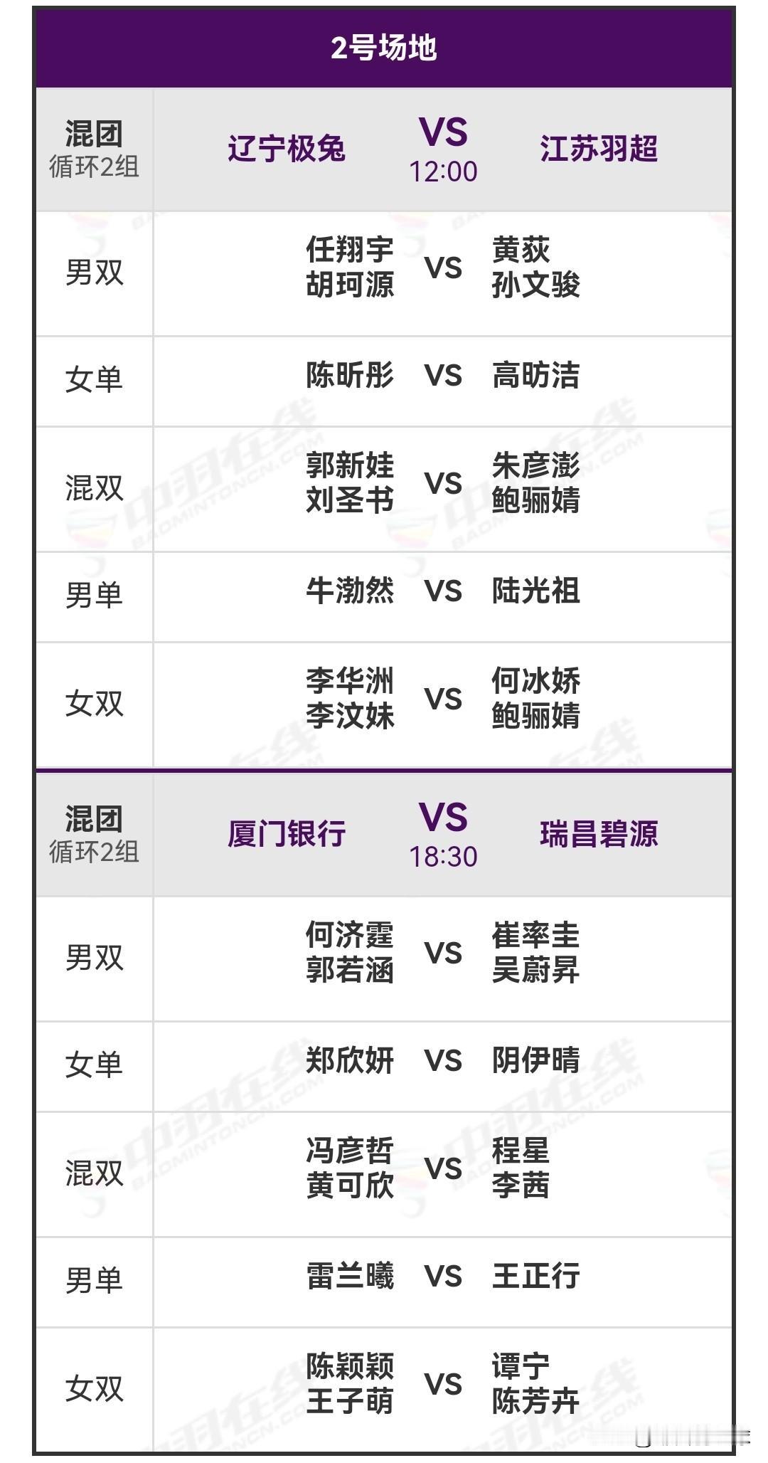 12月27日中国羽毛球俱乐部超级联赛赛程安排 今日混团循环赛继续进行,设有两块场地同时开赛。白天场于12:00开启,对阵双方分别是深圳羽众与芜湖兴航、辽宁极兔与江苏羽超;晚场18:30打响,对阵队伍为浙江竞体与青岛仁洲、厦门银行与瑞昌碧源。详细对阵名单如下: 羽球赛程 国羽赛程 羽毛球 羽毛球爱好者 羽毛球比赛 羽毛球赛事