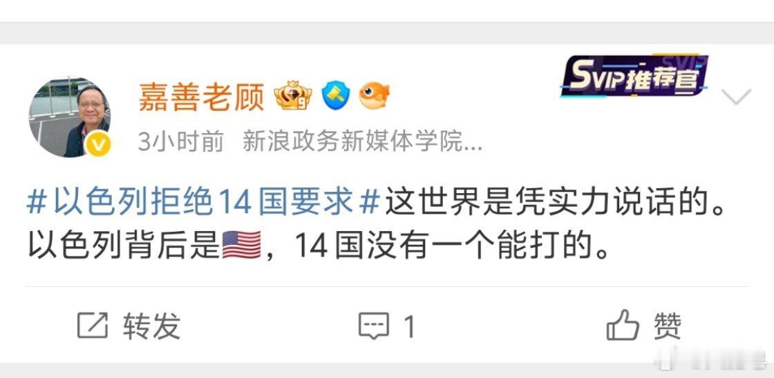 以色列拒绝14国要求 所以为什么要打呢?为什么要打呢?不打,像我们一样讲和平不行吗?你强就可以欺负别人?这不就是美国那一套逻辑吗。这个世界是凭实力说话,那所谓的道理,还讲不讲?如果都不讲理了,就靠拳头,这个世界不就又乱了吗?还是那句话,很多“绅士”演都不演了。还有,以色列背后不是美国,美国背后是以色列才合理。