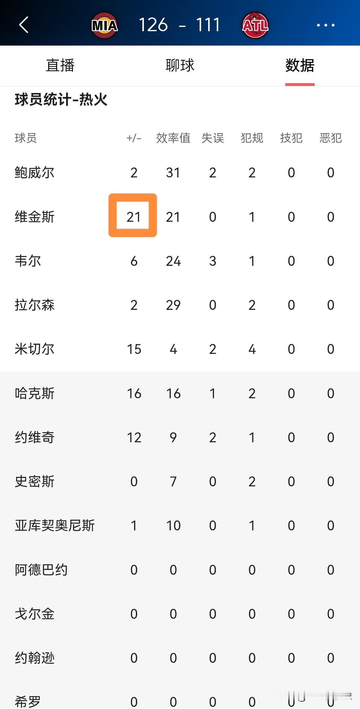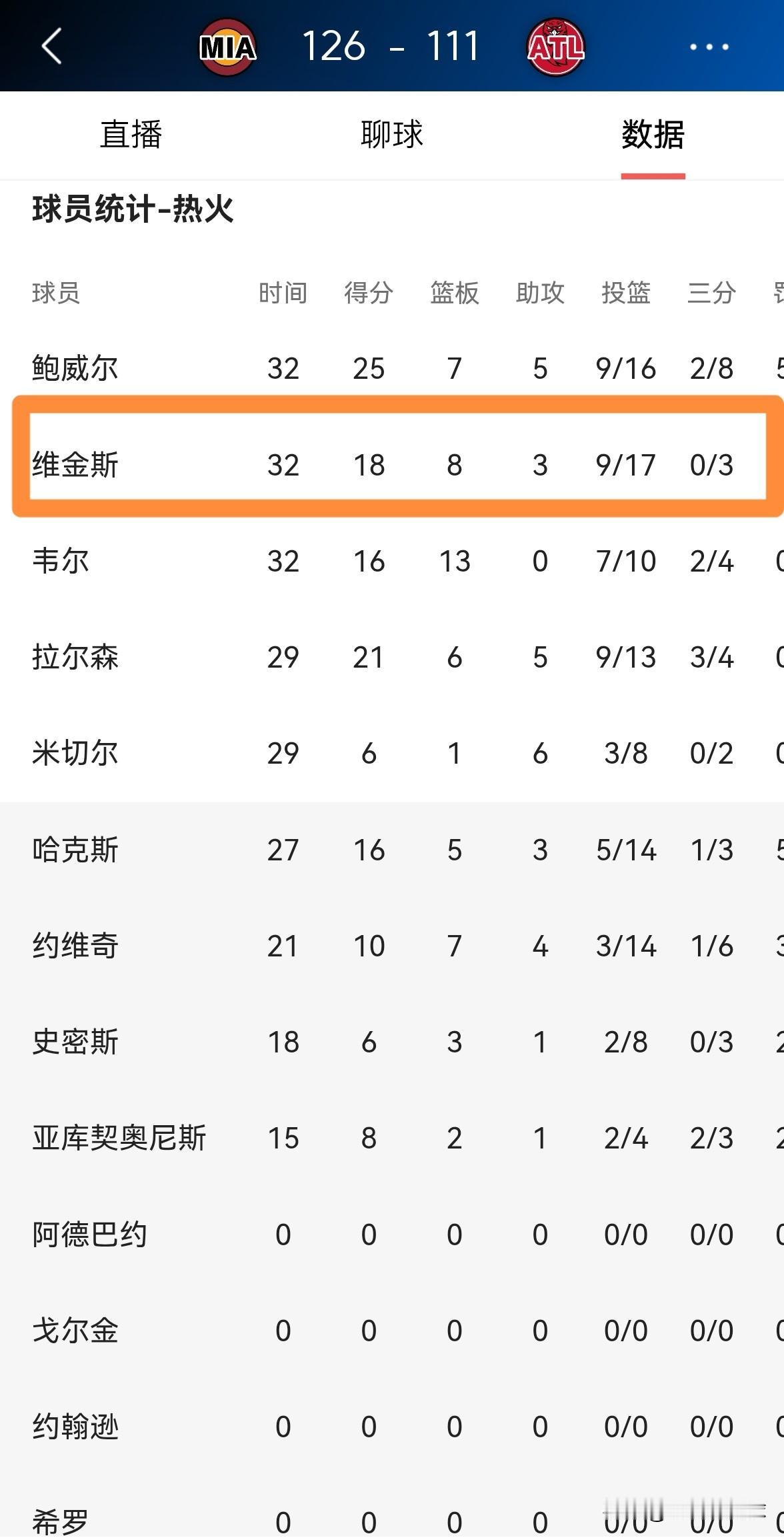 我忍不住要怒赞热火球星维金斯!在今天热火客场以126:111轻取老鹰的比赛中,维金斯真是攻防一肩挑,他在首发出战的32分钟里,投篮17中9非常高效的砍下18分8篮板3助攻1抢断1盖帽,他的场上正负值为全队最高的+21。 虽然维金斯的得分没有队友鲍威尔高,但是维金斯的防守能力要远远强于鲍威尔,维金斯堪称球队的攻防核心。