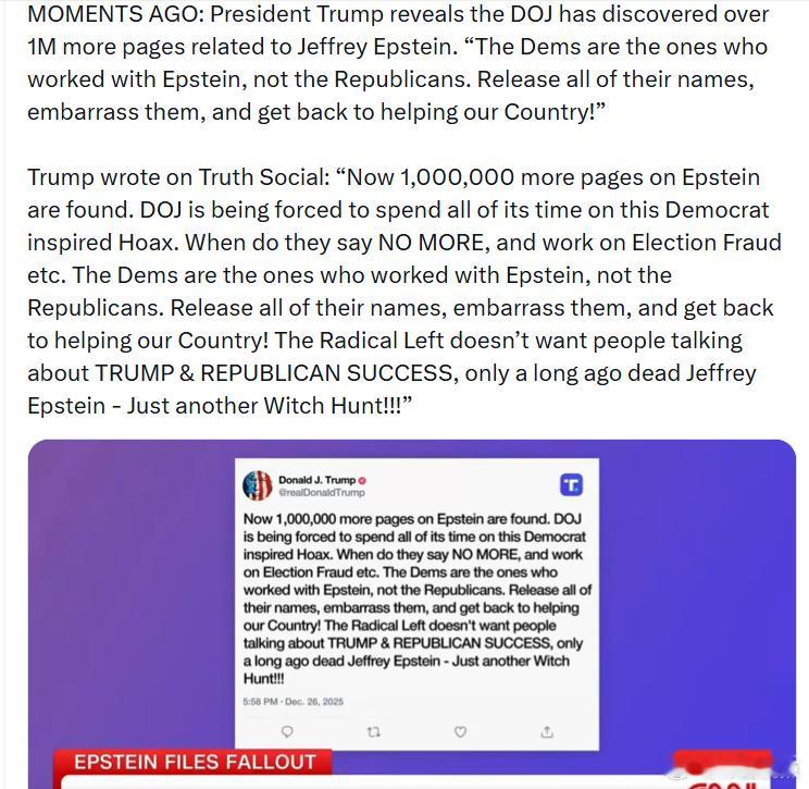 特朗普总统披露,司法部又发现了与杰弗里·爱泼斯坦有关的超过100万页文件。他说:“和爱泼斯坦合作的是民左党人,不是共和党人。把他们的名字全部公布出来,让他们颜面扫地,然后回去好好帮助我们的国家!”特朗普在Truth Social上写道:“现在又找到了100万页与爱泼斯坦有关的文件。司法部被迫把全部精力浪费在这个由民左党制造的骗局上。他们什么时候才会说‘够了’,然后去处理选举舞弊等真正的问题?和爱泼斯坦有往来的是民左党人,不是共和党人。把他们的名字全部公布出来,让他们出丑,然后回去帮助我们的国家!激进左派不想让人们讨论TRUMP和共和党的成功,只想反复炒作一个早已死去多年的杰弗里·爱泼斯坦——这不过是又一次猎巫行动!!!”