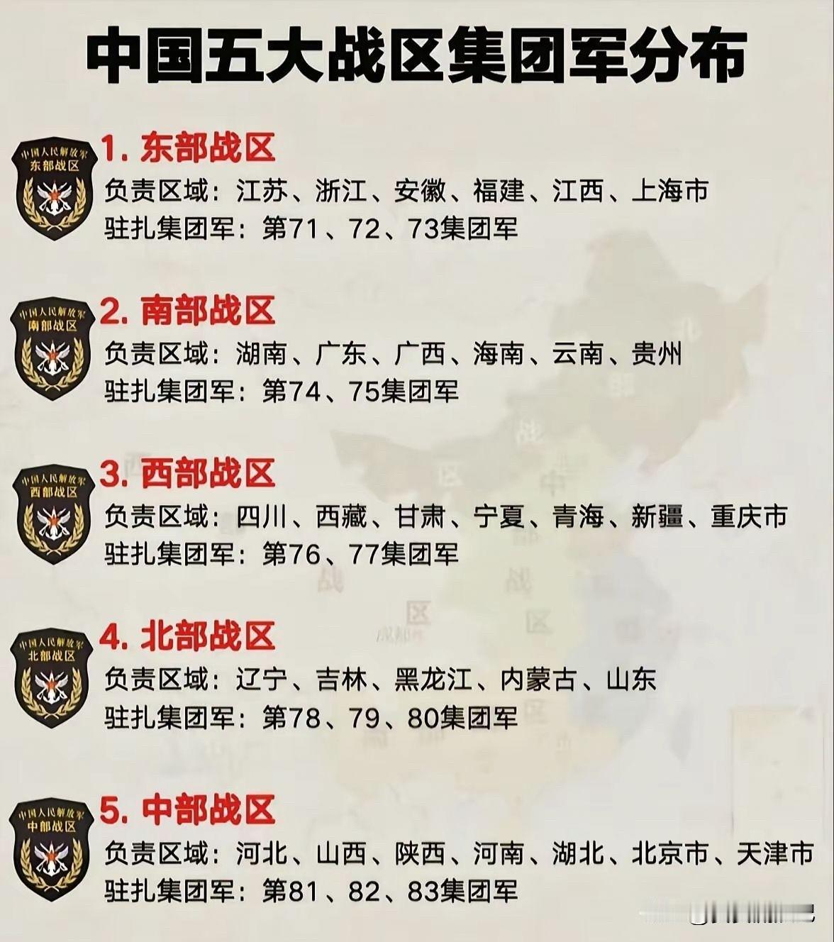 中国有五大战区,分布各有特点。东部战区,司令部驻南京,涵盖江苏、浙江、安徽、福建、江西五省和上海市,直面东海,拱卫我国东部沿海经济发达地区。 南部战区司令部在广州,管辖湖南、广东、广西、海南、云南、贵州,负责南海海域安全,对维护我国海洋权益至关重要。 西部战区司令部位于成都,包含四川、西藏、甘肃、宁夏、青海、新疆和重庆,守护广袤的西部边疆。 北部战区司令部驻沈阳,统辖辽宁、吉林、黑龙江、内蒙古和山东,肩负着东北和华北部分地区的防御重任。 中部战区司令部设在北京,领导和指挥河北、山西、河南、湖北、陕西和北京、天津,是守护首都及战略机动的重要力量。