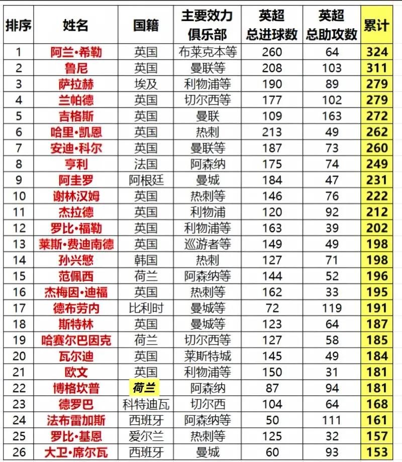 这个纪录早晚是哈兰德的,没有意见吧? 在上轮英超对阵西汉姆联中,哈兰德梅开二度,由此在英超已经打进104球,追平位列榜单第23的德罗巴进球数,但比这位切尔西魔兽整整少用了140场比赛! 在这个榜单中,现役球员只有萨拉赫和斯特林两人。以萨拉赫的高龄,即使再留下来也进不了几个球了。曼城名宿斯特林更不用提了,现在几乎都无球可踢。 而哈兰德刚与曼城续签了10年超长约,以保守的平均每个赛季进20+个球计,10年后就能轻松超越榜首。除了频繁的大伤和提前离队,谁能阻挡这个离谱的进球机器?