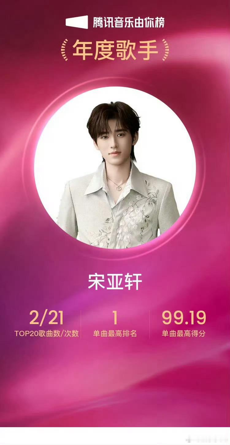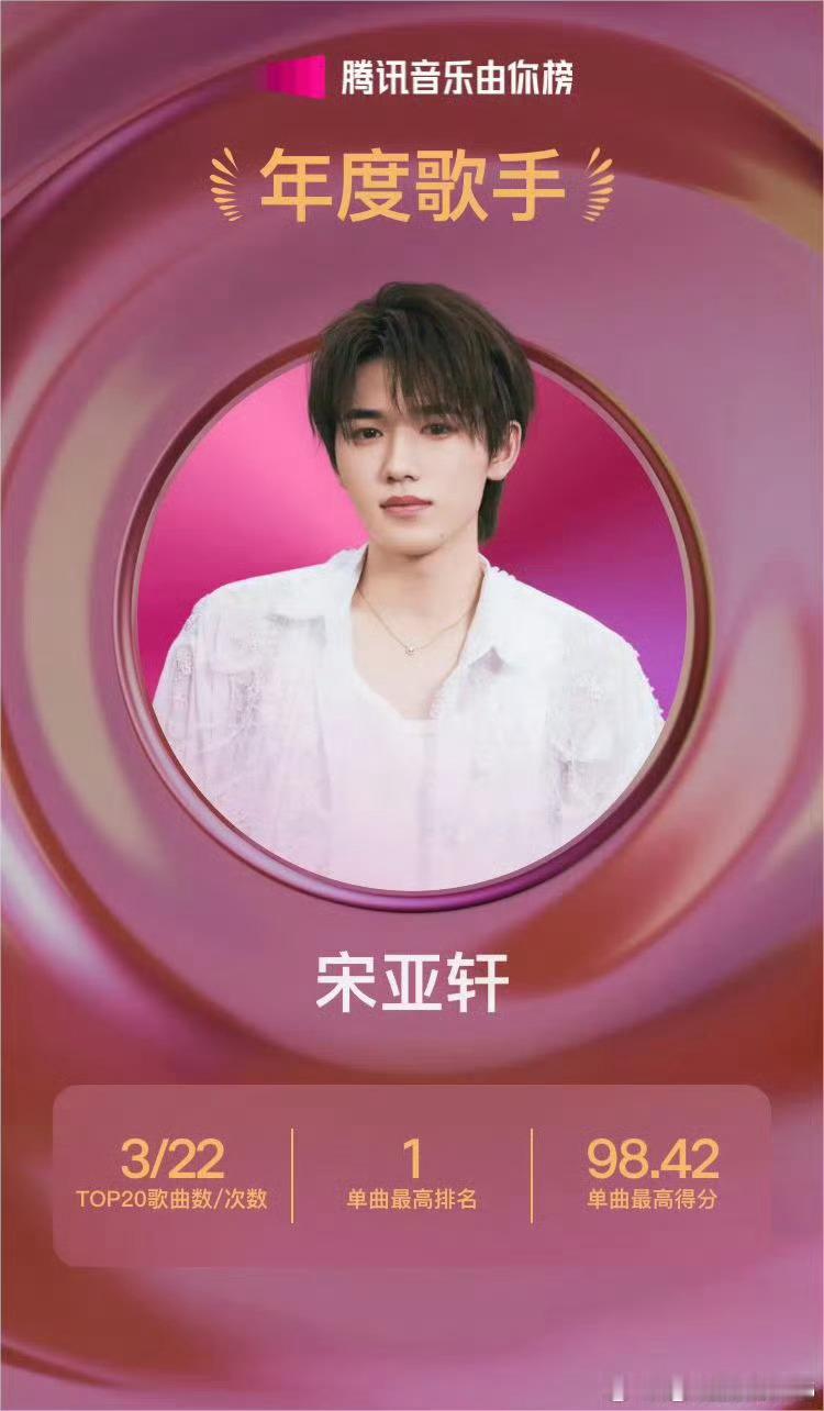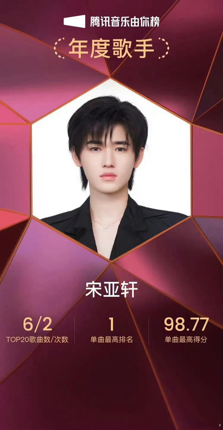 宋亚轩2025全年9首歌曲累计98次上榜,单曲《spr.》以99.19的综合得分打破纪录成为由你榜年度高分歌曲TOP1,拿下【由你榜年度歌曲】荣誉,还连续3年获得由你榜年度歌手,这个珍珠小子真的不一般!宋亚轩连续3年获得由你榜年度歌手