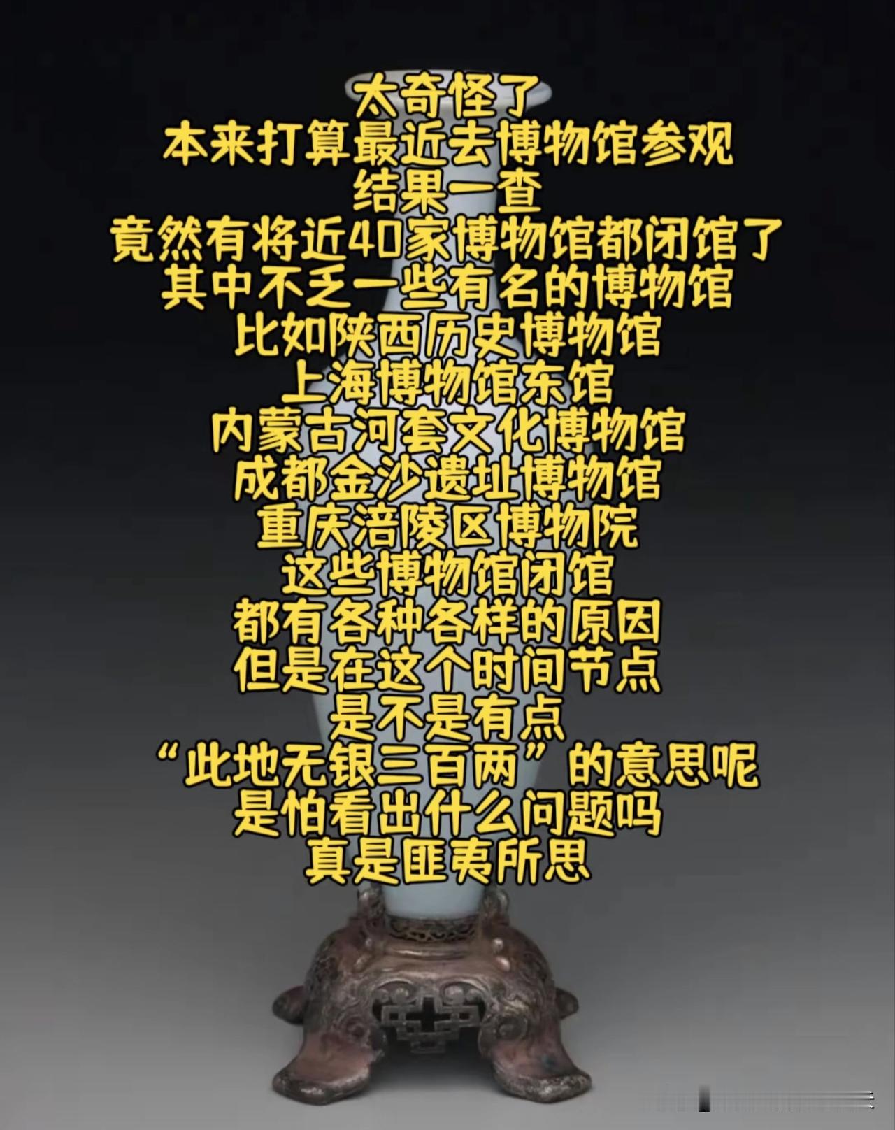 全国多地博物馆最近集体闭馆, 这时间点实在凑巧。 南京博物院调查组前脚刚进驻,后面就跟着一串闭馆公告。理由倒是五花八门,有的说设备检修,有的称内部整修。偏偏选在元旦春节前的参观旺季,难免让人多想。 博物馆本是守护历史的地方,公众的信任是其基石。当展柜里的文物真伪存疑,当捐赠的珍宝流向市场,这道基石便松动了。集体闭馆看似规避风险,实则可能寒了大家的心。毕竟,文物是全民的财富,不是哪个机构的私产。 希望这次调查能真正揭开谜底,让博物馆重新成为值得托付的地方。