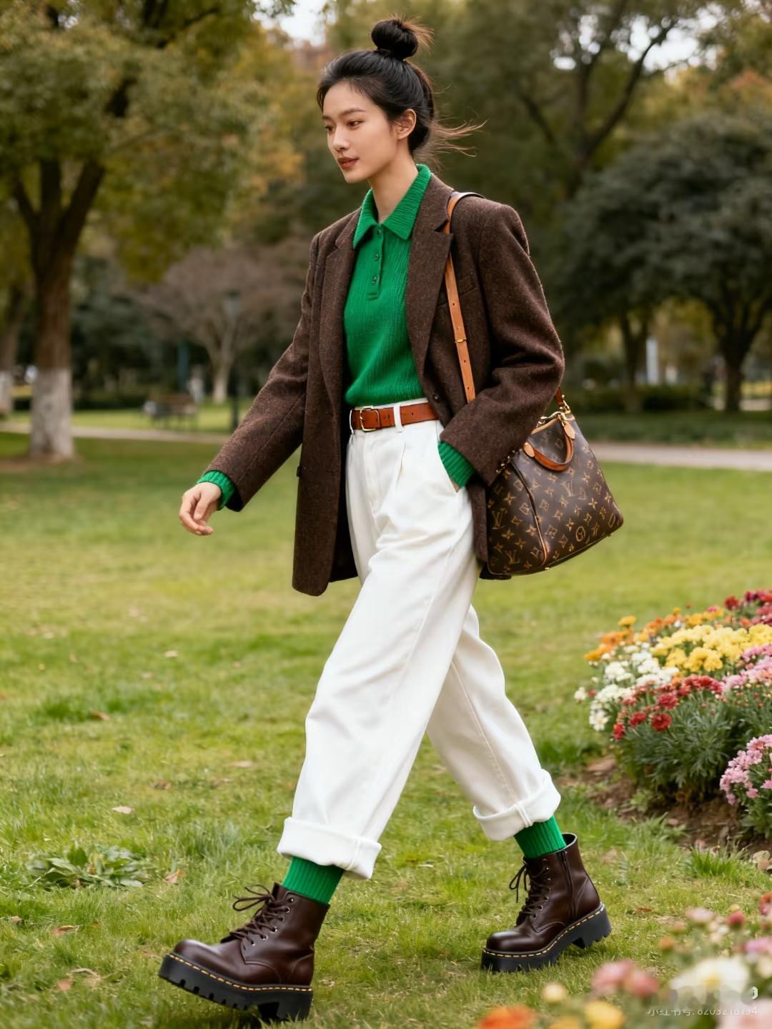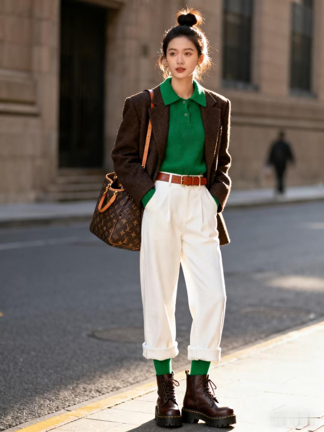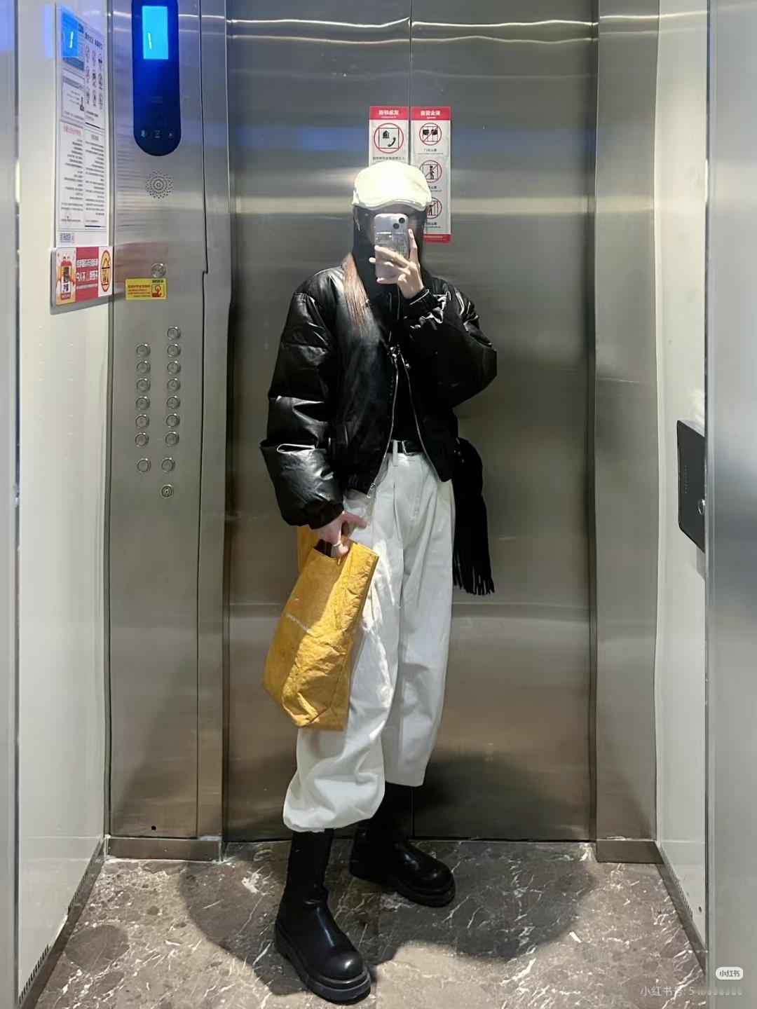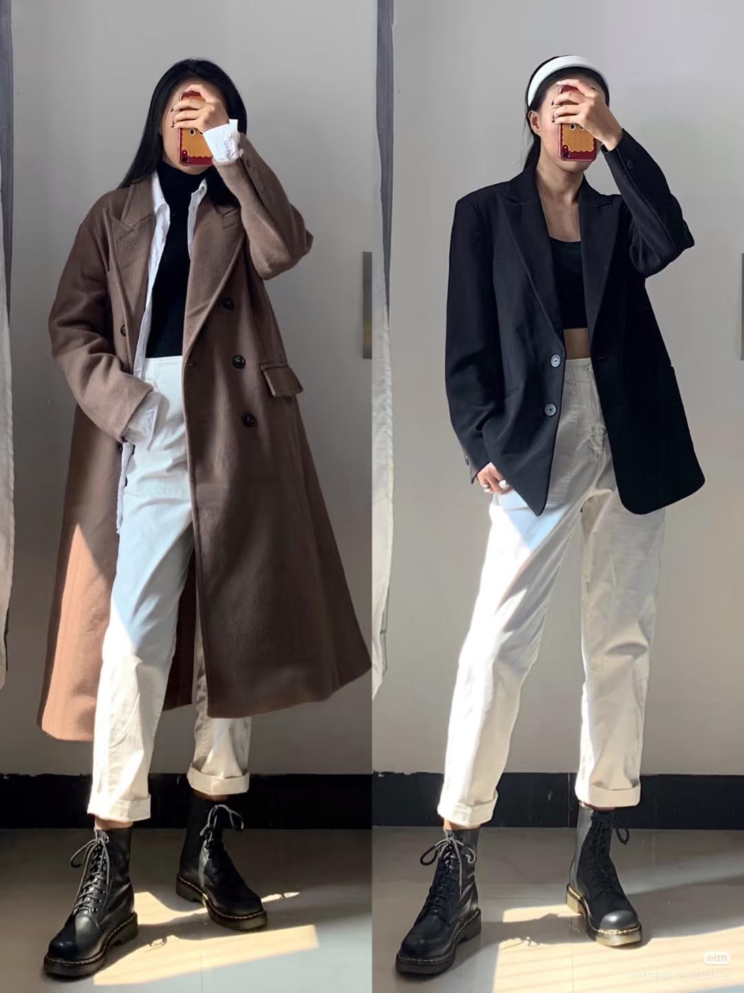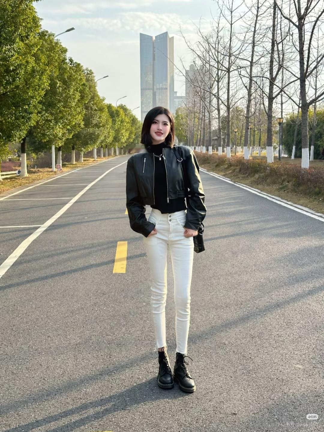 比如冬季的黑色皮夹克,内搭黑色高领打底衫,再搭配白色铅笔牛仔裤,展现修长匀称的双腿,脚蹬黑色马丁鞋,整体经典黑白配,简约又帅气。身材匀称的姐妹选择这样打扮,时髦显身材,走在街头就是一道靓丽风景。 对双腿不完美的朋友,下装可以选择版型宽松的白色阔腿裤搭配,再搭配黑色马丁靴,将裤脚向内折叠在靴筒最高处,用橡皮筋将腿脚扎紧,呈现出一种灯笼裤形状,凸显出纤细的靴筒。米色老爹帽与裤子颜色形成上下呼应,即便大腿粗、小腿不直,也能穿出帅气时髦又显瘦的造型。 而上半身不完美的姐妹,可以选择黑色短款羽绒服,长度在臀部以上胯骨以下的长度,刚好能遮掩腰腹部赘肉。再搭配白色烟管牛仔裤和黑色马丁靴,呈现出时髦又显瘦的造型。 除了搭配黑色短羽绒服,直筒版型大衣和宽松版型西装外套,都是不错选择。值得注意的是,马丁靴颜色与上衣外套或配饰包包、帽子颜色统一,造型更简洁大方。