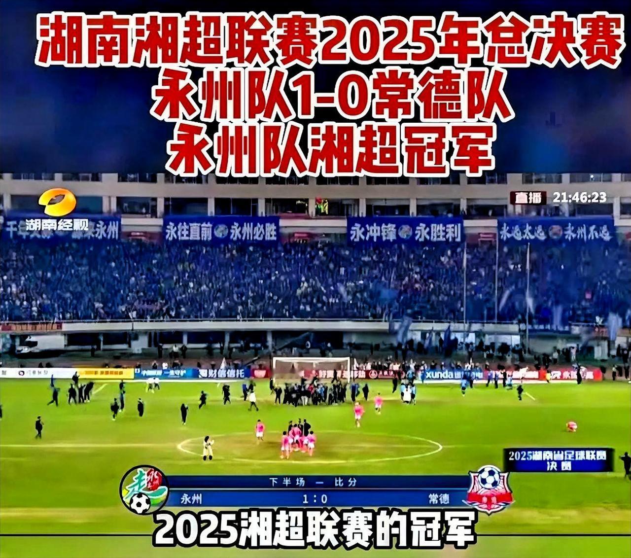 恭喜永州队2比1领先常德对,获得了湘超总冠军,可喜可贺!说实话,别小看永州这个城市经济一般般,在足球面前实力还是挺强的! 在所有的湘超联赛中,打了这么多场的球赛,一路走来确实不易。永州队真的很了不起![赞][赞][赞]