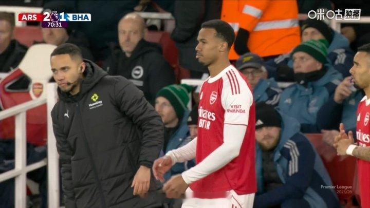 比赛第71分钟,加布、热苏斯替补登场,斯凯利、约克雷斯被换下阿森纳vs布莱顿