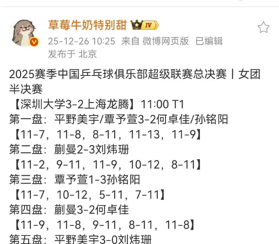 深圳大学赢球,要谢日本人。 不是孙颖莎,不是陈梦。是平野美宇,这个日本外援,在决胜盘厮杀到15-13,为中国俱乐部锁定了决赛门票。 她刚拿下WTT总决赛亚军,状态烫得吓人。乒超82%的胜率,每一场都是撕开防线的尖刀。上海队布下天罗地网——孙颖莎的省队启蒙教练坐镇,国家队级别的双打组合围剿——却被她一手反手拧拉,生生撕开了口子。 深大为她花了500万日元。今天看,血赚。她带来的不只是分数。是那种大赛淬炼出的冷血:关键分敢变线,落后时眼神更凶。第五盘,她看穿刘炜珊的扑正手习惯,连续两个回头球,砸穿了所有准备。 外援来华,早就不是新鲜事。但今晚,她成了孤胆英雄。中国乒乓的城墙,被自己的“养狼计划”里长大的狼,守住了。这戏码,比剧本还精彩。 决赛对阵王曼昱领衔的山东鲁能。真正的狙击,刚刚开始。 真正的胜负,不在国籍,而在那颗敢于刺穿黑夜的斗心。