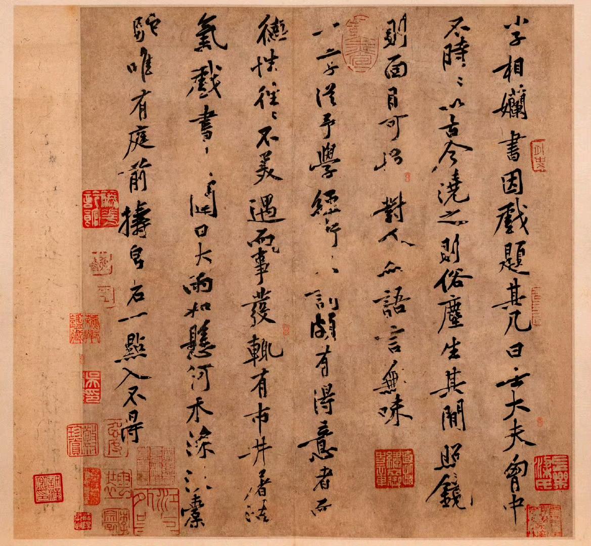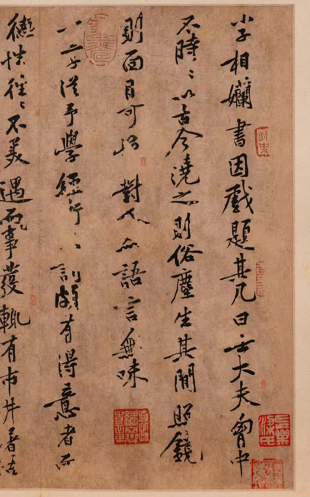 《小子相帖》宋·黄庭坚 纸本行书 纵31.3厘米,横33.3厘米 全帖共七行104字,全文为:小子相孏书,因戏题其几。曰:士大夫胸中不时时以古今浇之,则俗尘生其间,照镜则面目可憎,对人亦语言无味。一二子从予学经术 {文字缺失},颇有得意者,而德性往往不美,遇事而发,辄有市井屠沽气。戏书其闼。曰:大雨如悬河,水深汲橐驼,唯有庭前捣帛石,一点入不得。 此帖是其晚年贬谪黔州(今重庆彭水)期间(约1095-1097年)为教育儿子黄相所作的家书。此帖虽无作者款识,但因内容、风格与黄庭坚典型特征高度吻合,被公认为真迹。帖文以戏谑题跋的方式劝勉后辈,开篇“小子相孏(懒)书,因戏题其几”点明创作缘由,继而写下“士大夫胸中不时时以古今浇之,则俗尘生其间,照镜则面目可憎,对人亦语言无味”的千古名句,既告诫儿子要勤读古今、滋养心胸,也批评部分弟子学业有成却德性不足、沾染市井之气;文末“大雨如悬河,水深汲橐驼,唯有庭前捣帛石,一点入不得”以比喻收尾,用坚守自我的“捣帛石”暗喻为人应秉持初心、不被俗世污染,将家庭教育理念融入生动文字之中。 作为黄庭坚书法尚“韵”的典型体现,《小子相帖》持重风雅、舒朗有致,如朗月清风般兼具骨力与韵味,其用笔结体已脱离元祐年间的风格,更接近晚年愈发萧散苍厚的笔意,契合黄庭坚晚年“中宫紧收、四面开张”的书法风貌。 黄庭坚(1045-1105),字鲁直,号山谷道人,江西修水人,治平四年进士,官至起居舍人,工于行草,与苏轼、米芾、蔡襄并称“宋四家”,其晚年历经贬谪,在困顿中完成艺术境界升华,此帖便是其书法与人生感悟的双重结晶。 此帖的收藏脉络传承有序,宋末至明末流入民间,被收入《快雪堂法帖》卷四,题为《杂记二则》;明末清初为收藏家李宗孔珍藏,钤有“广陵李书楼珍赏图书”等印鉴,后转至清初鉴赏大家笪重光手中,成为其收藏的八件黄庭坚书法之一;清代中后期经叶云谷递藏,于道光十八年被梁章钜购得,与苏轼《自书诗》合装为《宋苏文忠黄文节合璧册》;近代由民国银行家、收藏家许汉卿秘藏,钤“许氏汉卿珍藏”印;20世纪末至21世纪初,上海博物馆从许汉卿后人处购藏此帖。