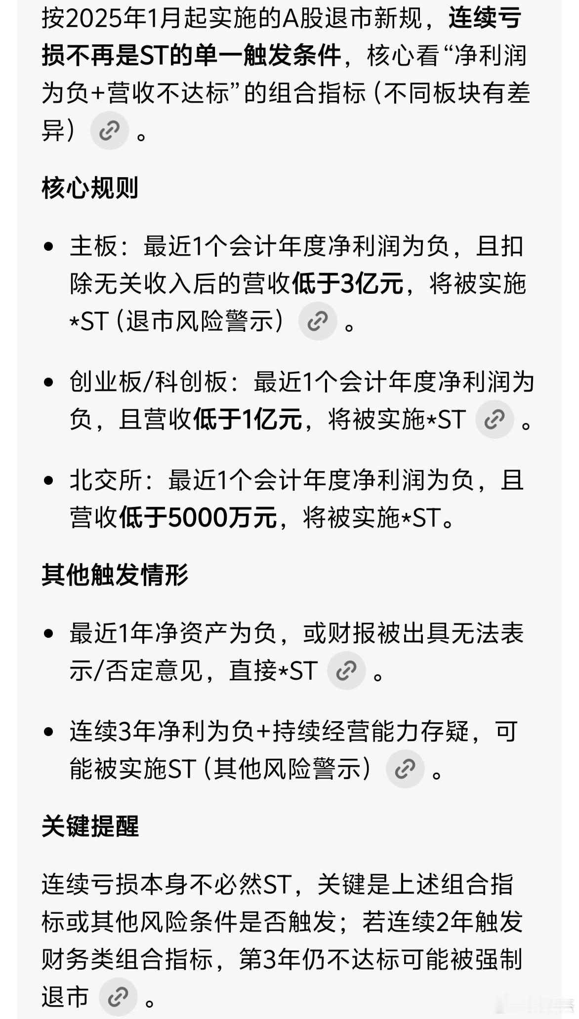 一季度谨防踩退市风险的雷了,注重营收和净资产财务报告,业绩亏损,主板营收低于3亿,创业板 科创板低于1亿,都要被st的。。。st里面财务没有改观要被退市的,包括被立案调查的也要谨防强制退市。收到666a股