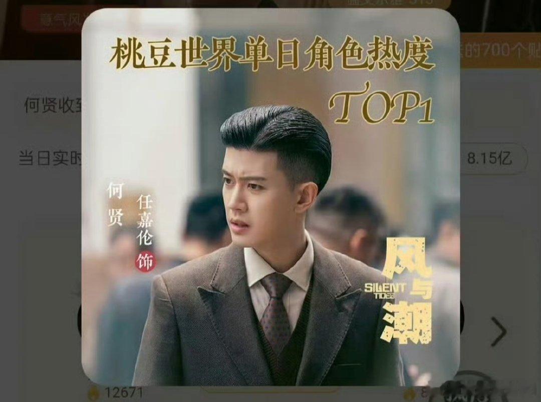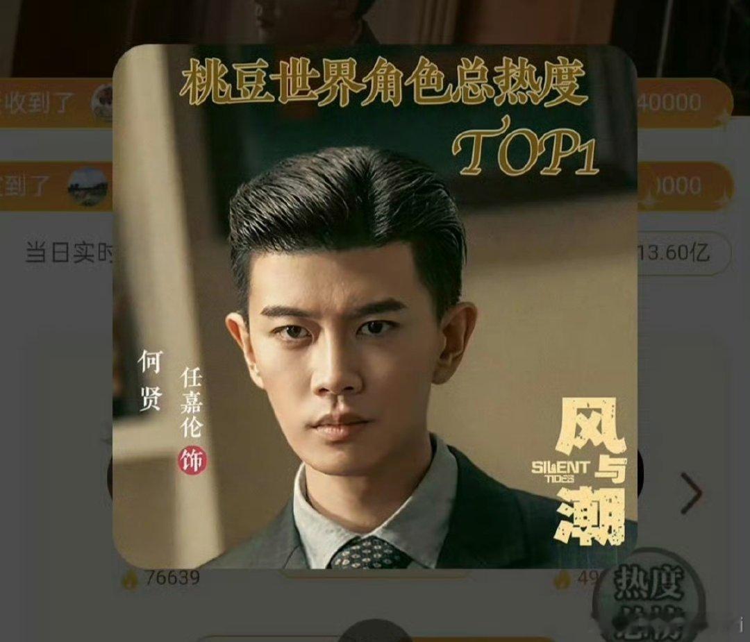 任嘉伦《风与潮》何贤登顶爱奇艺桃豆世界角色总热度榜和日榜TOP1!恭喜任嘉伦