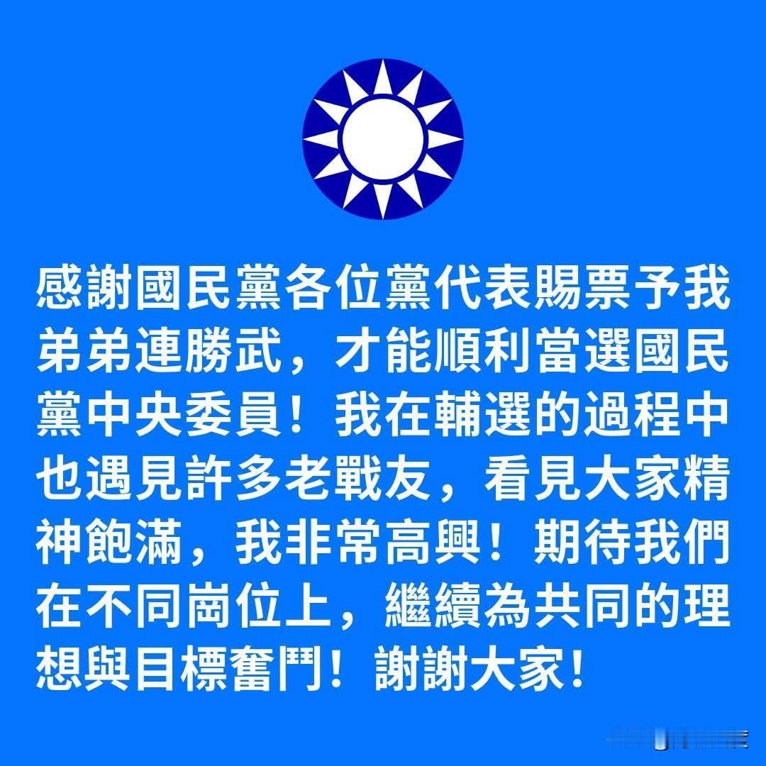 连胜文弟连胜武首次参选中央委员以第9名当选,连胜文特脸书拜谢。连胜武现任青年部主委,将接续其兄政治之路! 在此次当选的190名中央委员中,连胜武名列第9,足见连胜武在蓝营中颇受好感,当然也与连胜文的影响力不无关系。 连胜文随后在脸书贴图表示,感谢国民党各位党党代表赐票予我弟弟连胜武,才能顺利当选国民党中央委员!我在辅选的过程中也遇见许多老战友,看见大家精神饱满,我非常高兴!期待我们在不同岗位上,继续为共同理想而奋斗! 足见连家兄弟情深,祝福连胜武的未来的政治道路越走越宽!