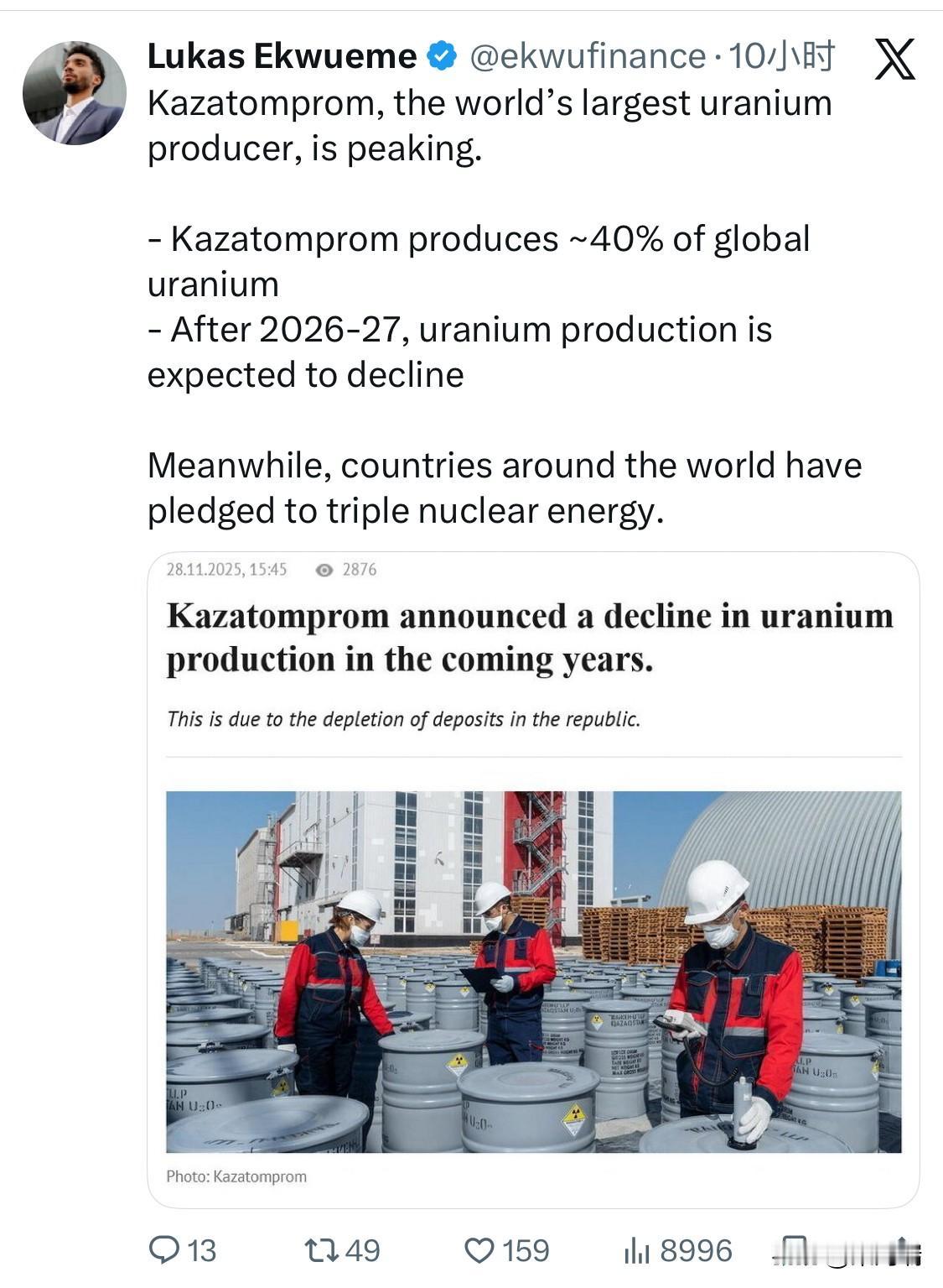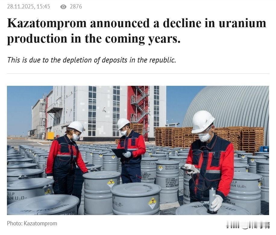 全球最大的铀生产商哈萨克斯坦原子能公司(Kazatomprom)的产量已达峰值。 - 哈萨克斯坦原子能工业公司(Kazatomprom)生产全球约40%的铀 - 预计2026-2027年后,铀产量将下降 与此同时,世界各国都承诺将核能规模扩大三倍。