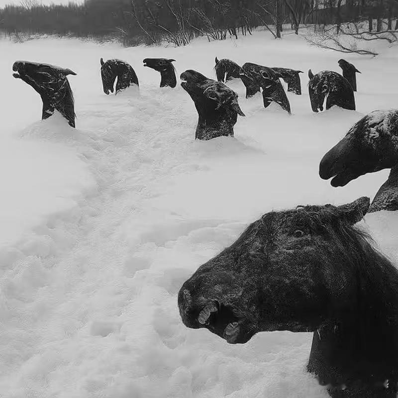 这些马都冻成了冰雕,据说在西伯利亚的冰湖里,每年冬天都会出现这样的景观,也许这些马是到冰湖喝水的时候,被陷到了冰面里,于是就再也出不来了,不知道这些马是野生的,还是人工饲养的,感觉现在野马的数量不是很多,所以不像是野马!