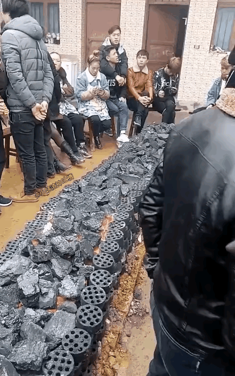 这应该是在农村家里头举行什么活动,由于外面天气很冷,就用蜂窝煤取暖,这东西的效果是非常不错的。我们小时候家里举行活动的话,那时候主要是烧木头疙瘩,比如年轻人娶媳妇的时候,来的亲亲友友都比较多,屋子里根本就容纳不下,一般都在外面待着,这时就需要在院里点起一堆火,主要燃料就是木头疙瘩,因为这东西抗烧,现在生活条件都好了,开始用蜂窝煤了。