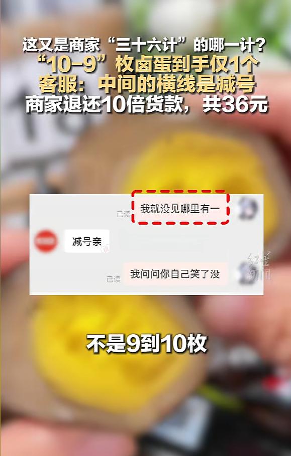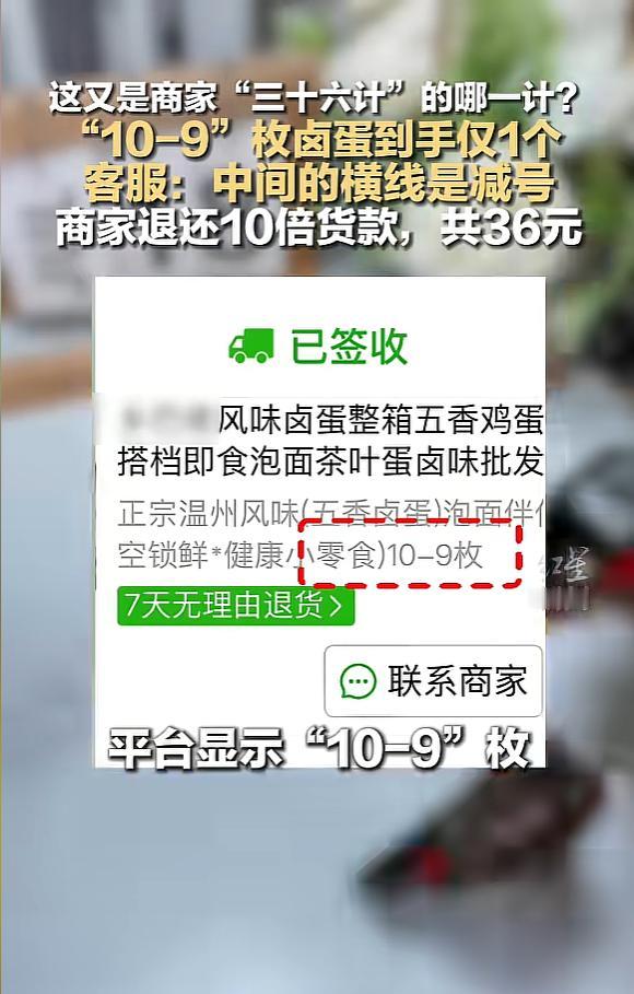 “离了个大谱!”近日,河南,一男子网购卤蛋,看到商品页面标注10-9枚,本以为能收到9到10枚卤蛋,结果收货后却发现仅到手1枚,对方表示,页面上的“-”是减号,10减9,所以1枚卤蛋没毛病。男子:问问你自己笑了没。 河南三门峡一名男子的网购经历,在社交平台上掀起了一阵讨论热潮。 话题的核心,是一枚卤蛋,以及商家一套让人哭笑不得的“数学解释”。 不少网友刷到相关分享后,纷纷调侃“套路比卤蛋还多”,还有人趁机吐槽自己过往遇到的类似网购陷阱,一时间引发了大量共鸣。 这一切的起因,要从男子一次看似划算的下单说起。 当时他偶然看到一款卤蛋的标价,3.6元的价格对应着页面上“10-9枚”的标注。 在大多数人的认知里,这种数字中间带横线的标注,都是数量区间的意思,也就是说,花3.6元能买到9枚或10枚卤蛋。 觉得性价比很高的男子,没再多琢磨,直接付了钱等待收货。 几天后,快递送达时,男子刚拿到包裹就觉得不对劲。 包裹轻飘飘的,体积也小得可怜,完全不符合9到10枚卤蛋该有的分量和包装规格。 带着一丝疑惑,他快速拆开包裹,里面的景象让他瞬间愣住,原本期待的9枚或10枚卤蛋不见踪影,只有一枚卤蛋孤零零地躺在包裹里。 第一反应里,男子以为是商家打包时出了差错,漏发了数量。 他立刻找到商家客服,说明情况并询问原因,希望对方能核实后补发货品。 可客服给出的回复,直接打破了他的预期,还让他感到了明显的被套路感。 客服明确表示,页面上的“-”不是数量区间符号,而是数学里的减号,10减9等于1,所以只发一枚卤蛋是完全合理的,不存在漏发的情况。 这样的解释,让男子既无奈又气愤。 他觉得商家是在刻意钻文字的空子,利用大众的普遍认知制造误解,从而吸引消费者下单。 越想越觉得离谱的他,把自己的下单页面、收到的包裹以及和客服的沟通情况整理好,发布到了社交平台,想让大家评评理。 网友们看到后,纷纷加入讨论。 有人吐槽,现在有些商家根本不用心做产品,反而把心思都花在了这种投机取巧的文字游戏上,破坏网购市场的信任。 更有不少有过类似经历的网友,分享了自己的踩坑故事。 有人买标注“100”的垃圾袋,到手才发现标注的是100克而非100个。 有人买标注超长续航的小家电,实际使用时间和宣传差了一大截。 随着舆论热度越来越高,商家那边也有了动静。 在男子发布视频的第二天,商家主动联系了他,不仅退还了3.6元的实付款,还给出了10倍金额的赔偿,总共36元。 与此同时,涉事的“10-9枚卤蛋”商品链接,也被商家连夜下架,如今再去平台搜索,已经找不到相关页面了。 这起看似微小的纠纷,其实折射出了网购市场里的一个常见乱象:部分商家为了吸引流量、促成交易,刻意用模棱两可的表述制造低价假象,侵犯消费者的知情权。 很明显,涉事商家的做法,已经触碰了这条法律红线,也违背了基本的经营准则。 对于经营者来说,低价引流或许能带来短期的订单,但想要长久经营,靠的从来不是套路。 经营的底线,是诚信二字。 用文字游戏欺骗消费者,或许能赚一时的小钱,却会彻底消耗掉消费者的信任,而信任一旦失去,就很难再重建。 踏踏实实做好产品,明明白白标注信息,用真诚的服务打动消费者,才是能让生意走得远的根本。 这起卤蛋事件,也给所有经营者提了个醒:投机取巧终不长久,守住诚信底线,才能在市场里站稳脚跟。
