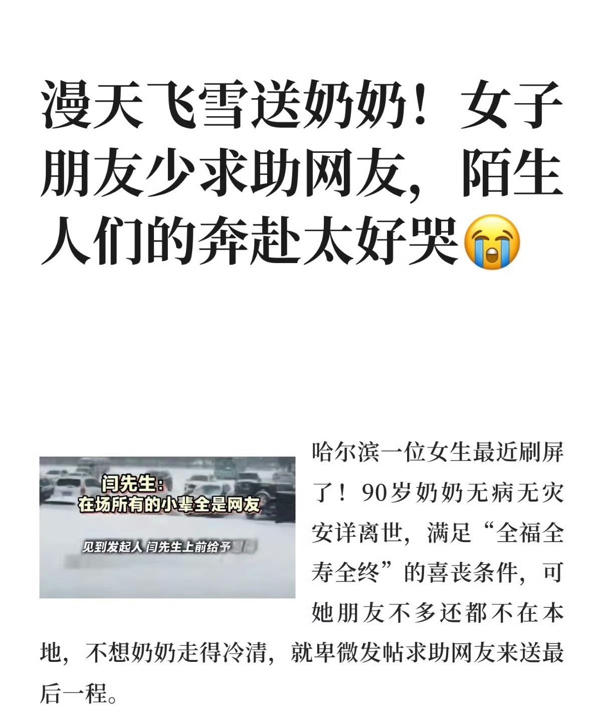 在哈尔滨,有个姑娘正面临着一件既喜庆又心酸的事儿。她90岁的奶奶寿终正寝,按老理儿这叫“喜丧”,本该热热闹闹地给奶奶办一场体面的葬礼。可姑娘心里却堵得慌,她的朋友不多,大多又不在哈尔滨,她实在不忍心让从小疼爱自己的奶奶走的时候冷冷清清,连个送行的人都没几个。犹豫再三,她鼓起勇气在社交平台上发了一封求助信,她没想搞多大排场,只是单纯希望有陌生人能来送奶奶最后一程,哪怕只是鞠个躬、走个过场也好,她承诺会报销路费,准备伴手礼和用餐券,字里行间满是真诚与无奈。 没想到,这封求助信就像一颗投入湖面的石子,激起了千层浪。无数网友被她的孝心和坦诚打动,纷纷留言报名,有人甚至开始帮她出谋划策。到了葬礼那天,哈尔滨偏偏下起了罕见的大雪,雪花漫天飞舞,拍在脸上生疼,路也滑得厉害,打车难如登天,公交也迟迟不来。但这恶劣的天气,反倒成了检验善意的试金石。 来自浙江的叶先生和女友,本来是在东北旅游的,看到求助信后,毫不犹豫地调整了行程。他们提前一天就订了离殡仪馆近的酒店,可当天还是因为大雪和堵车,差点没赶上。他们一路打听,最后在殡仪馆工作人员的指引下,追到了十公里外的火化场。在那里,他们看到了十几个同样素不相识的年轻人,有本地的,有路过的游客,还有放假的大学生,大家都是为了同一个承诺而来。本地的闫先生,前一天工作到凌晨三点,几乎没怎么睡,为了赶早上的仪式,顶着风雪出门,原本十几分钟的路,硬是走了四十多分钟,但他一句怨言都没有,心里只想着不能让姑娘失望。 当这些来自五湖四海的陌生人,站在奶奶的晶棺前,默默鞠躬、默哀的时候,那种庄重和肃穆,丝毫不亚于任何一场盛大的葬礼。他们陪着姑娘,送奶奶走完了最后一程。姑娘感动得说不出话来,她没想到,自己一句卑微的求助,竟然换来了这么多陌生人的温暖奔赴。这些网友,就像冬日里的一把火,用他们的守信和善良,驱散了姑娘心中的孤单,也让这场喜丧变得格外有意义。漫天的飞雪,仿佛也在为这份难得的人间真情而动容,这场告别,没有悲伤的窒息,只有温暖的流动,它让人们相信,无论世界怎么变化,人与人之间的那份牵挂和善意,永远不会消失。高龄老人喜丧 哈尔滨老太太 哈尔滨老奶奶 来源:潇湘晨报