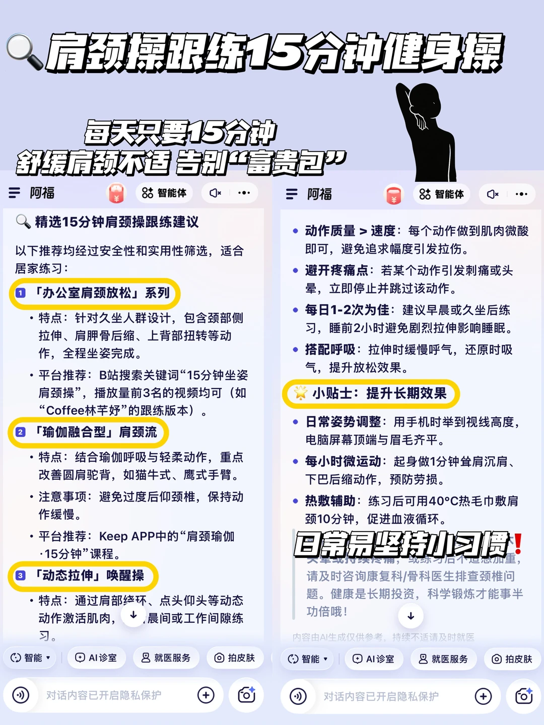 我问阿福肩颈操跟练15分钟健身操、帕拉梅拉燃脂瘦身操瘦全身、跳操减肥30分钟完整版、古法瘦身操各有什么推荐吗,他没有直接给我一堆健身视频,而是针对性拆解不同操课重点,热身、训练、放松拉伸都有具体的文字版时长计划,一目了然〰再也不用盲目跟练,轻松把减肥操瘦全身的效果拉满,效率和效果都大大的提高!