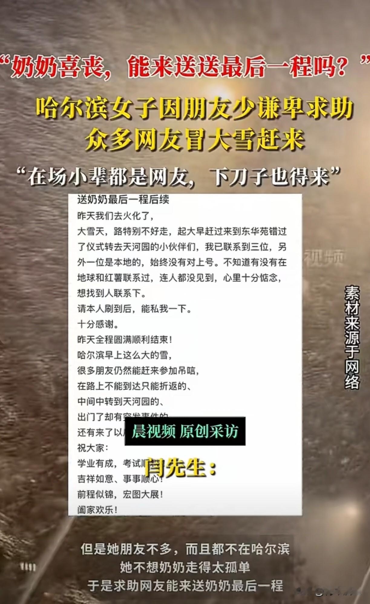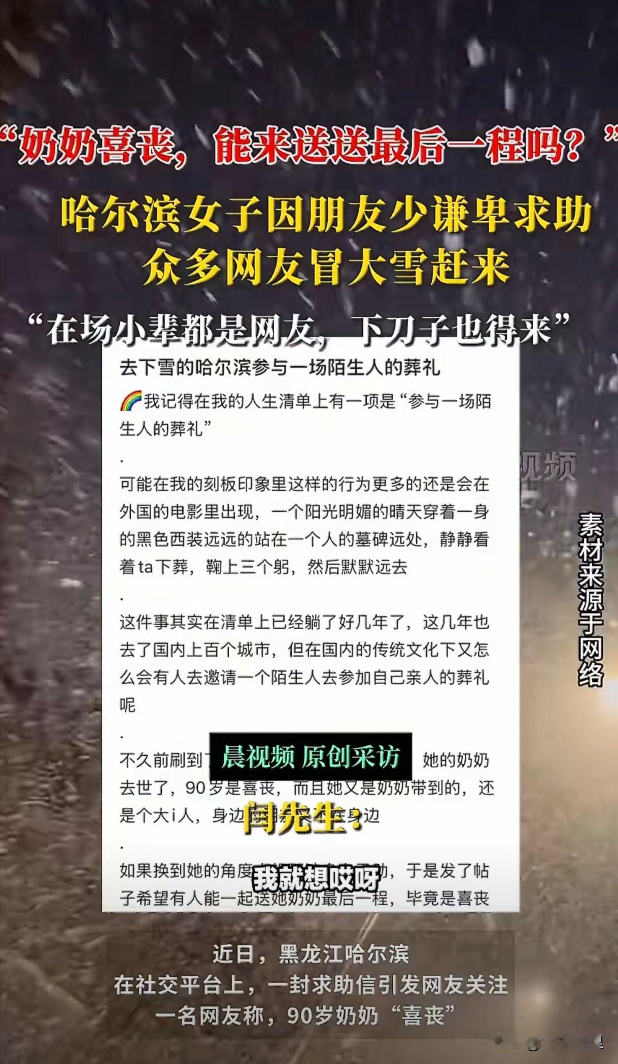 这种新闻看着看着眼圈就热了。 哈尔滨一个女孩为办喜丧的奶奶发帖求助,只因奶奶朋友不多,怕老人走得孤单。没想到,一夜之间,数千网友回应。 葬礼那天遇上暴雪,天冷路滑,可答应要来的人还是从各处赶来了,有旅行中途改道的南方游客,有凌晨三点下班、彻夜未眠的本地大哥,这些素未谋面的人们聚在一起,规规矩矩地鞠躬,为奶奶送行。 原来世上最温暖的,莫过于陌生人之间这份郑重的承诺。大雪纷飞,赴约而来,送一位老人安静远行。